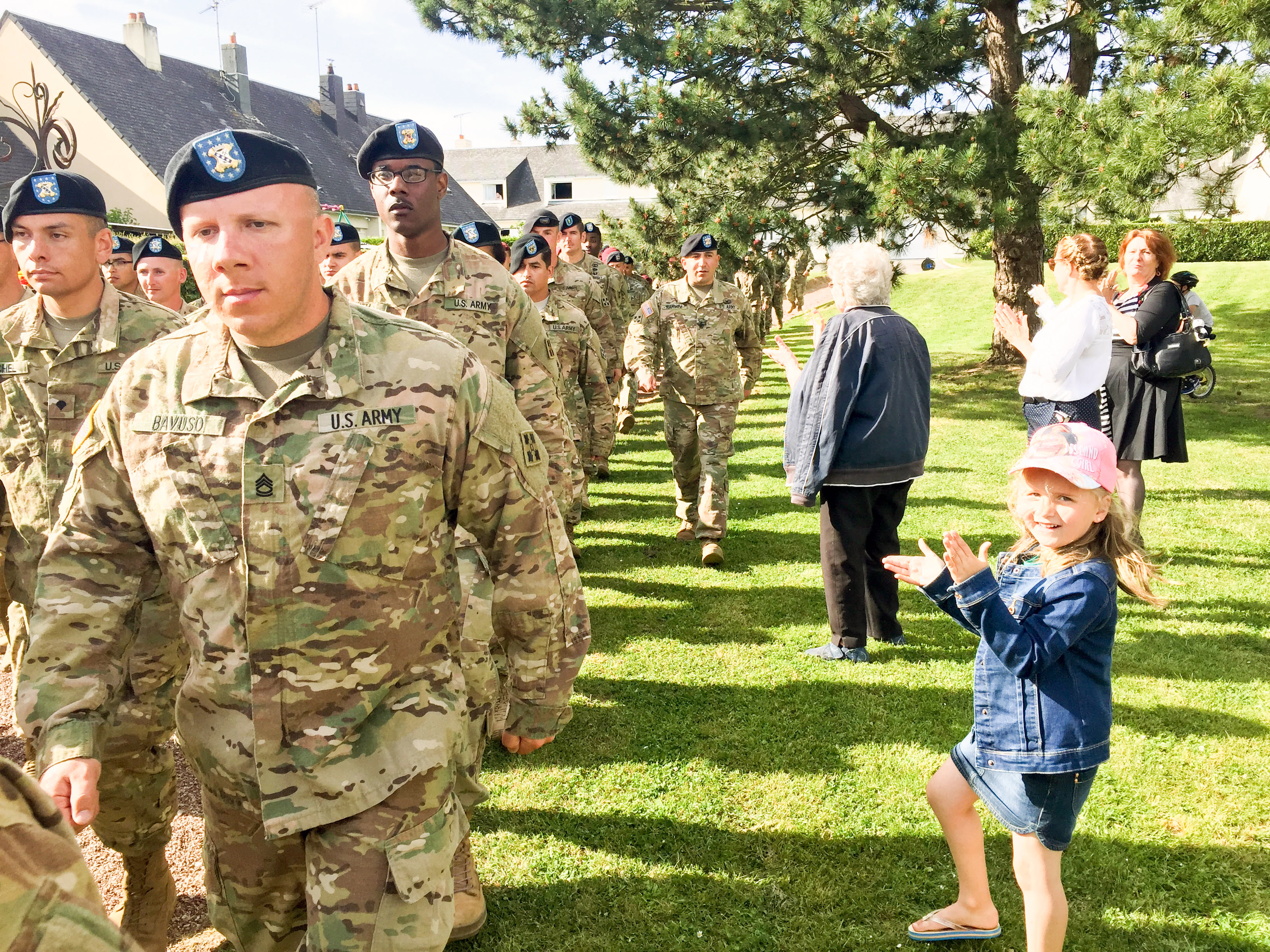 More than 100 Soldiers, joined the commanding general, French compatriots and people of Montebourg, during a march from the town center to the memorial wall. Select Soldiers from "Fighting Eagles" Battalion of the 3rd ABCT, 4th Inf. Div., participated in the march, the memorial dedication ceremony and dinner hosted by Montebourg civic leaders.