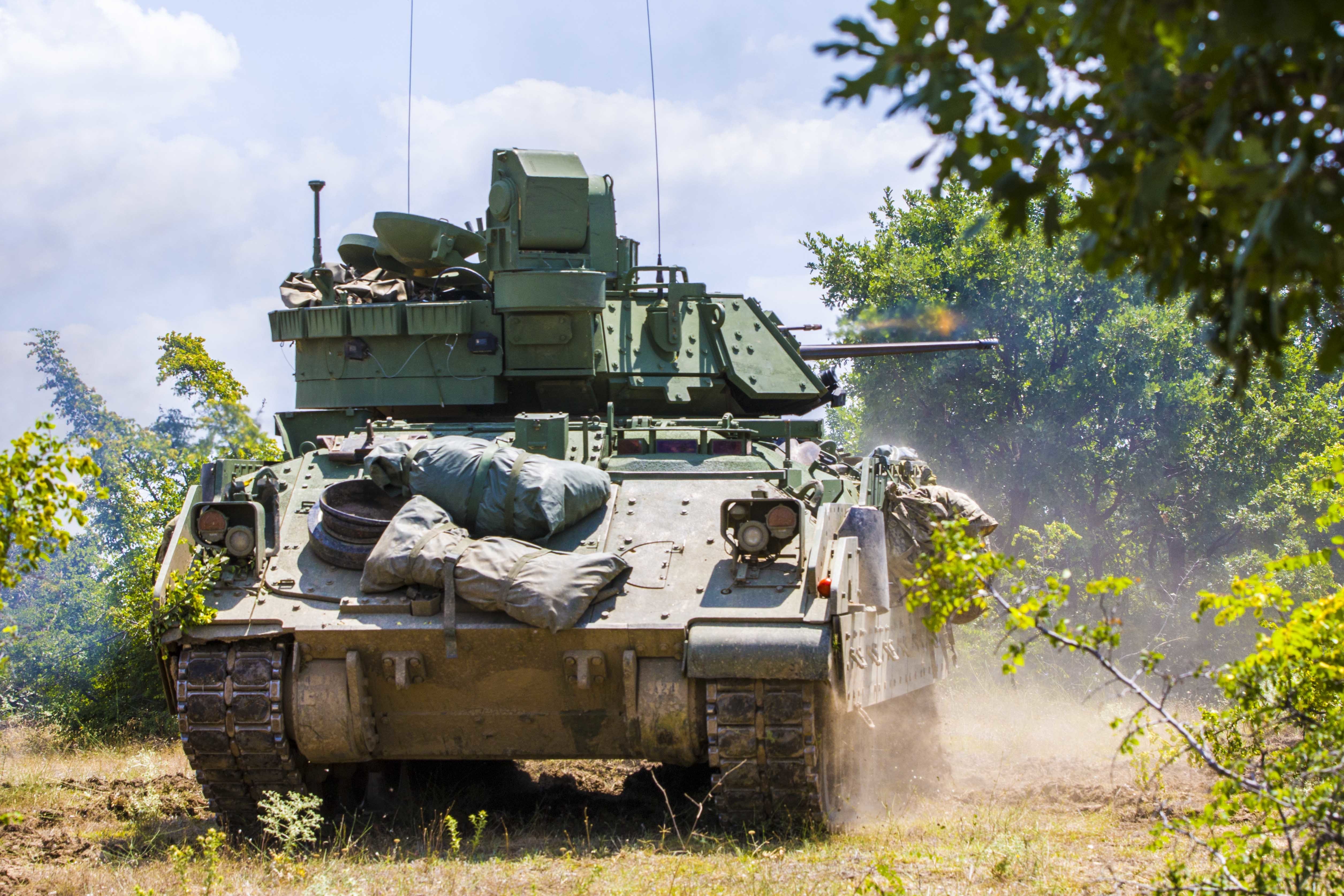 A Bradley Fighting Vehicle from 1st Battalion, 8th Infantry Regiment, 4th Infantry Division, defends a position during a combined live fire exercise titled Peace Sentinel at Koren, Bulgaria, on July 19. Exercise Saber Guardian 17 is a U.S. European Command, U.S. Army Europe-led exercise in the Black Sea Region that builds readiness and improves interoperability among the 20 Allies who participate. (U.S. Army photo by Spc. Thomas Scaggs) 170717-A-TZ475-443