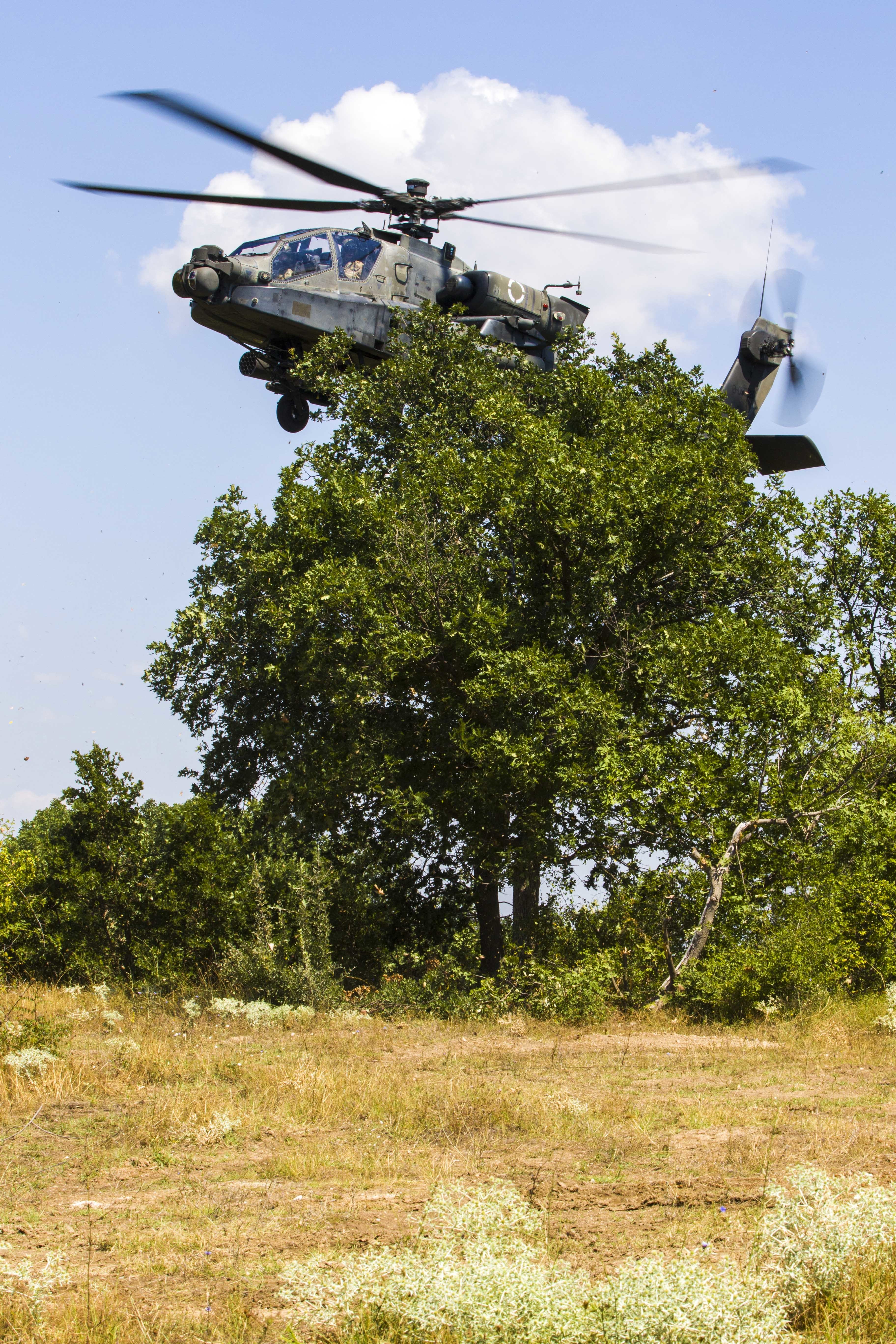 An AH-64 Apache helicopter from C Company, 1-501st Attack Reconnaissance Battalion, Task Force Falcon, 10th Combat Aviation Brigade, flies towards an objective during a combined live fire exercise titled Peace Sentinel at Koren, Bulgaria, on July 19. Exercise Saber Guardian 17 is a U.S. European Command, U.S. Army Europe-led exercise in the Black Sea Region that builds readiness and improves interoperability among the 20 Allies who participate. (U.S. Army photo by Spc. Thomas Scaggs) 170717-A-TZ475-412