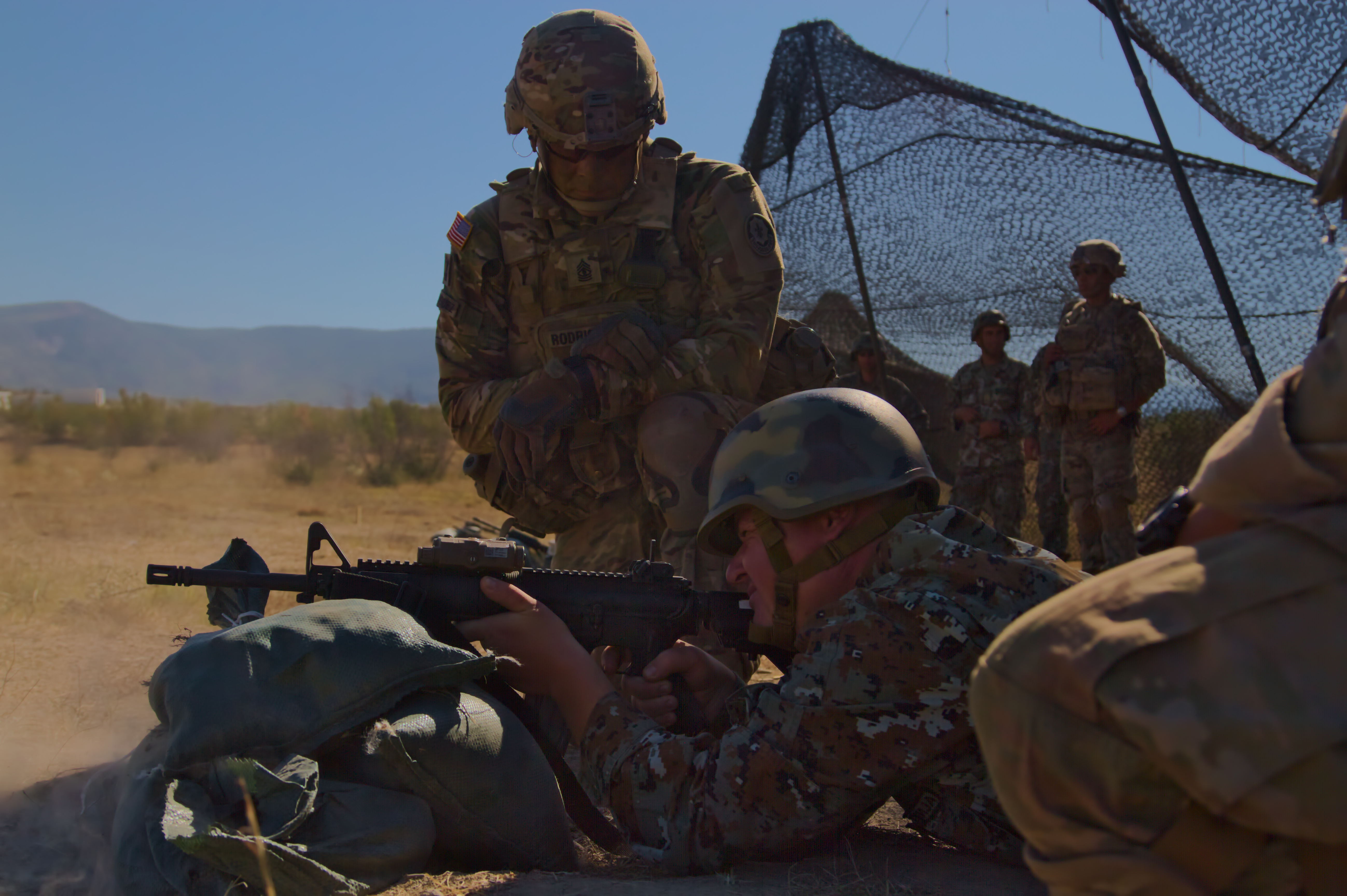 U.S. Army 1st Sgt. Roy Rodriguez, first sergeant of Troop A, Regimental Engineering Squadron, 2nd Cavalry Regiment, guides Macedonian Pvt. Ivica Petrov, a soldier with 1st Platoon, Engineering Battalion, on firing an M4 rifle during a firing range at Krivolak Training Area, Macedonia on August 1, 2017. The Regimental Engineering Squadron is currently working in country as a part of Dragoon Guardian, an offshoot of Operation Atlantic Resolve, a NATO mission involving the U.S. and Allied and partnered nations in Europe, designed to promote peace and deter aggression across the region. (Photo by Army Pfc. Nicholas Vidro, 7th Mobile Public Affairs Detachment)