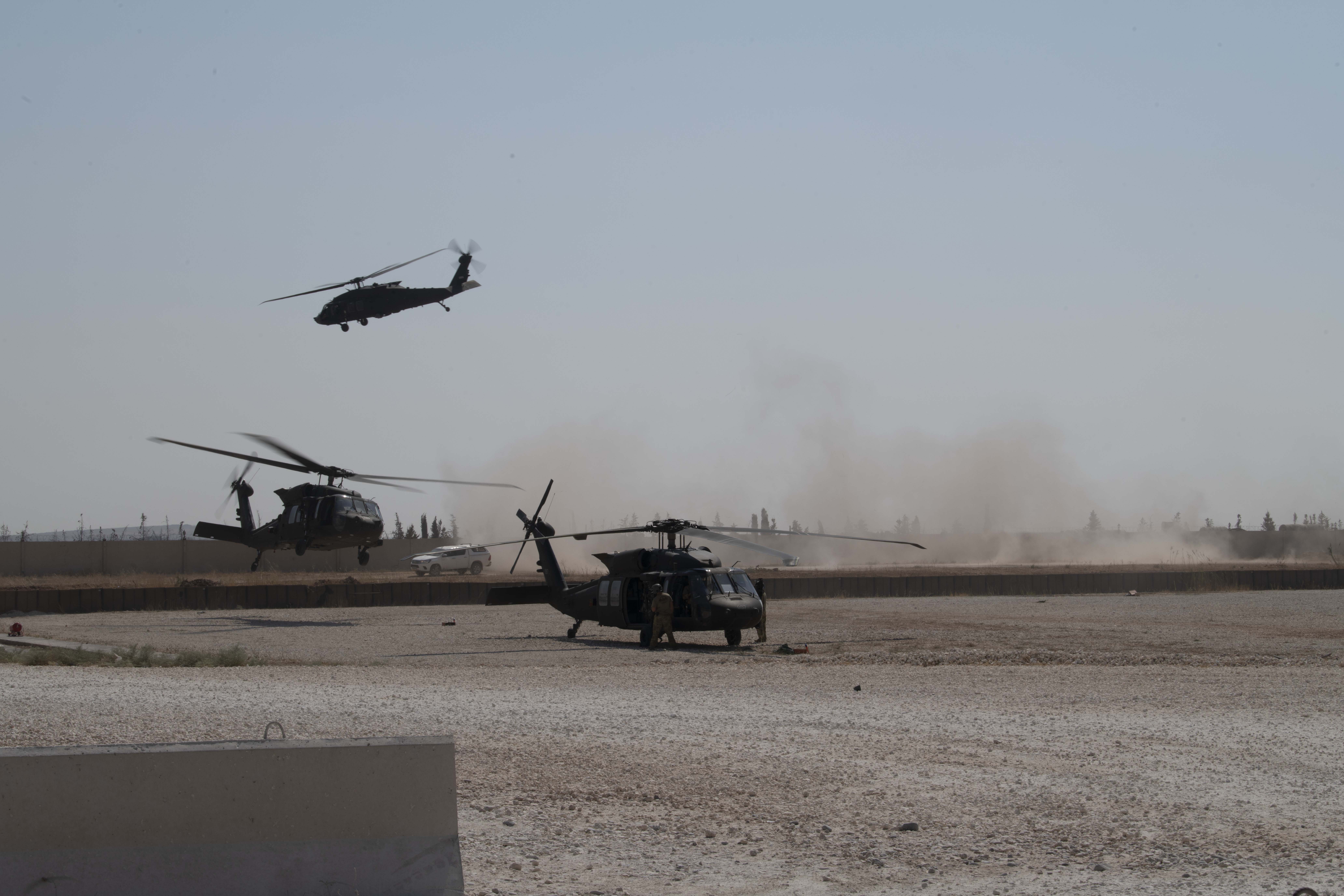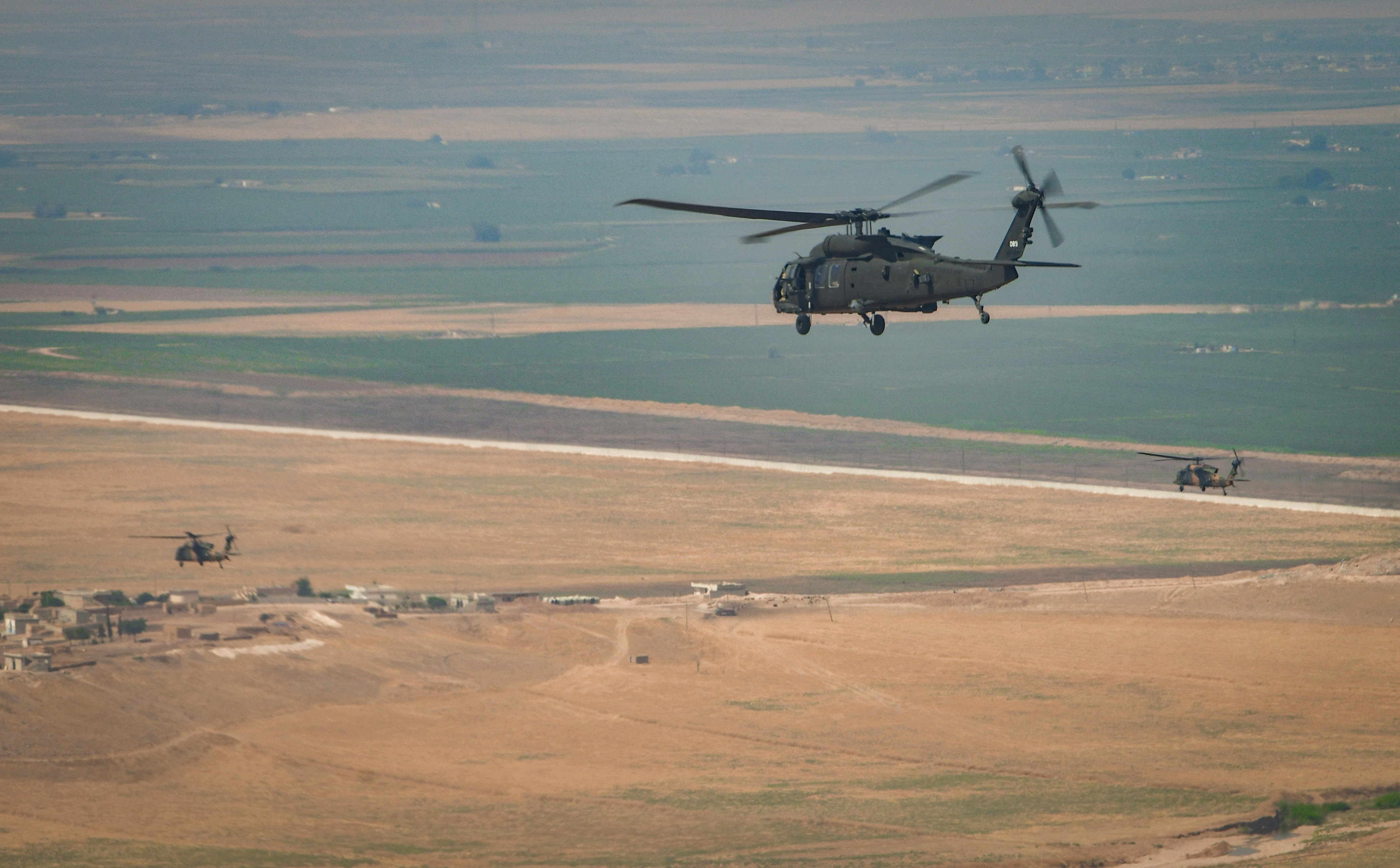 U.S. Army UH-60 Black Hawks take off for a joint aerial patrol of the security mechanism zone with Turkish military helicopters in northeast Syria, Sept. 5, 2019. The security mechanism is intended to secure and stabilize the Turkey-Syria border in a sustainable manner, ensure campaign continuity in the Global Coalition's efforts to defeat Daesh, and limit any uncoordinated military operations. The security mechanism will be executed in designated phases and in a coordinated and combined manner to ensure security and stability along the Turkey-Syria border. (U.S. Army photo by Spc. Alec Dionne)