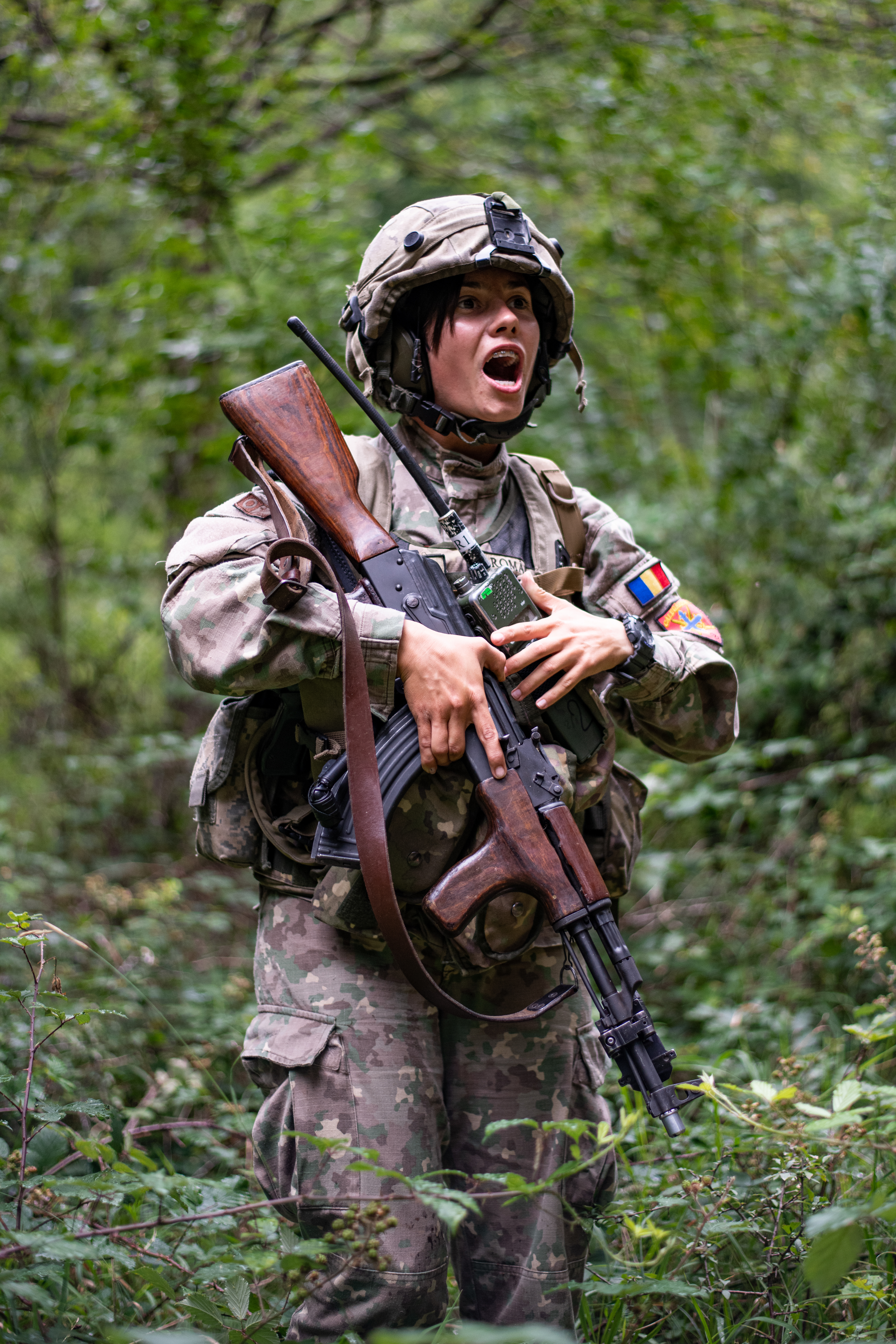 A Romanian Soldier from 2nd Infantry Battalion Călugăreni, 1st Brigade Argedava training alongside the 173rd Airborne Brigade and 1st Battalion, 4th Infantry Regiment gives commands to her squad leaders while assaulting an envelopment area during a battalion engagement Aug. 16, 2020 as part of Exercise Saber Junction 20. This exercise is taking place at the Joint Multinational Training Center in the Hohenfels Training Area, Germany from Aug. 10 to Aug. 26, 2020.