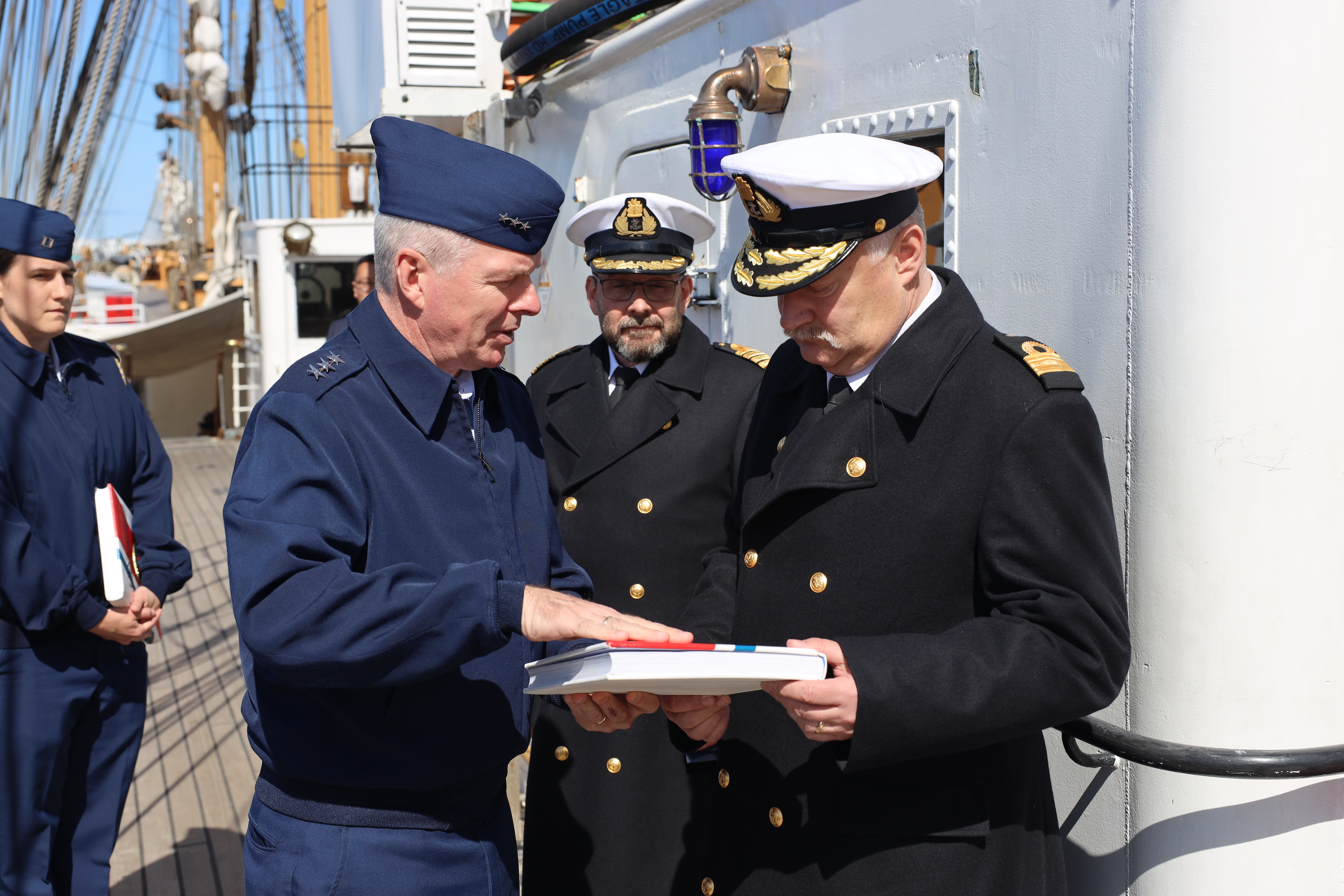 Vice Adm. Steven Poulin, commander U.S. Coast Guard Atlantic Area, presents Commadore Asgrimur Asgrimsson of the Icelandic coast guard a gift aboard USCGC Eagle (WIX 327), "America's Tall Ship," in Reykjavik, Iceland, June 12, 2021. Poulin was in Iceland to meet with Arctic partners from the U.S. embassy, ministry, and coast guard. (Photo courtesy U.S. Embassy Reykjavik, Kristjan Petersson)