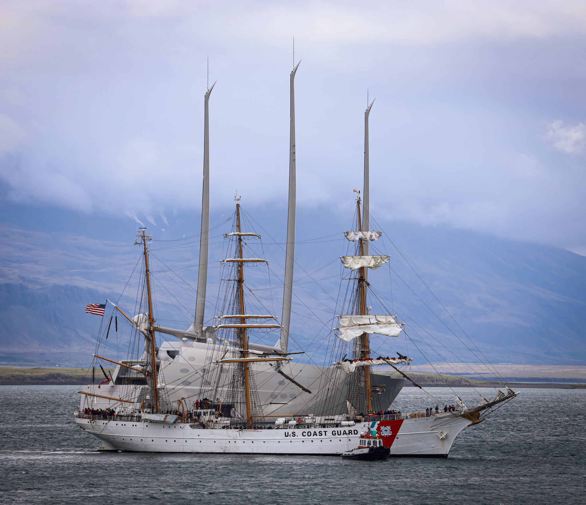 USCGC Eagle (WIX 327), "America's Tall Ship," arrives in Reykjavik, Iceland, on June 9, 2021. Eagle is currently conducting summer U.S. Coast Guard Academy cadet training in at-sea leadership and professional development. Their first port call was Portugal in late May. Eagle has served as a classroom at sea to future Coast Guard officers since 1946, offering an at-sea leadership and professional development experience as part of the Coast Guard Academy curriculum. (Photo courtesy U.S. Embassy Reykjavik, Kristjan Petersson)