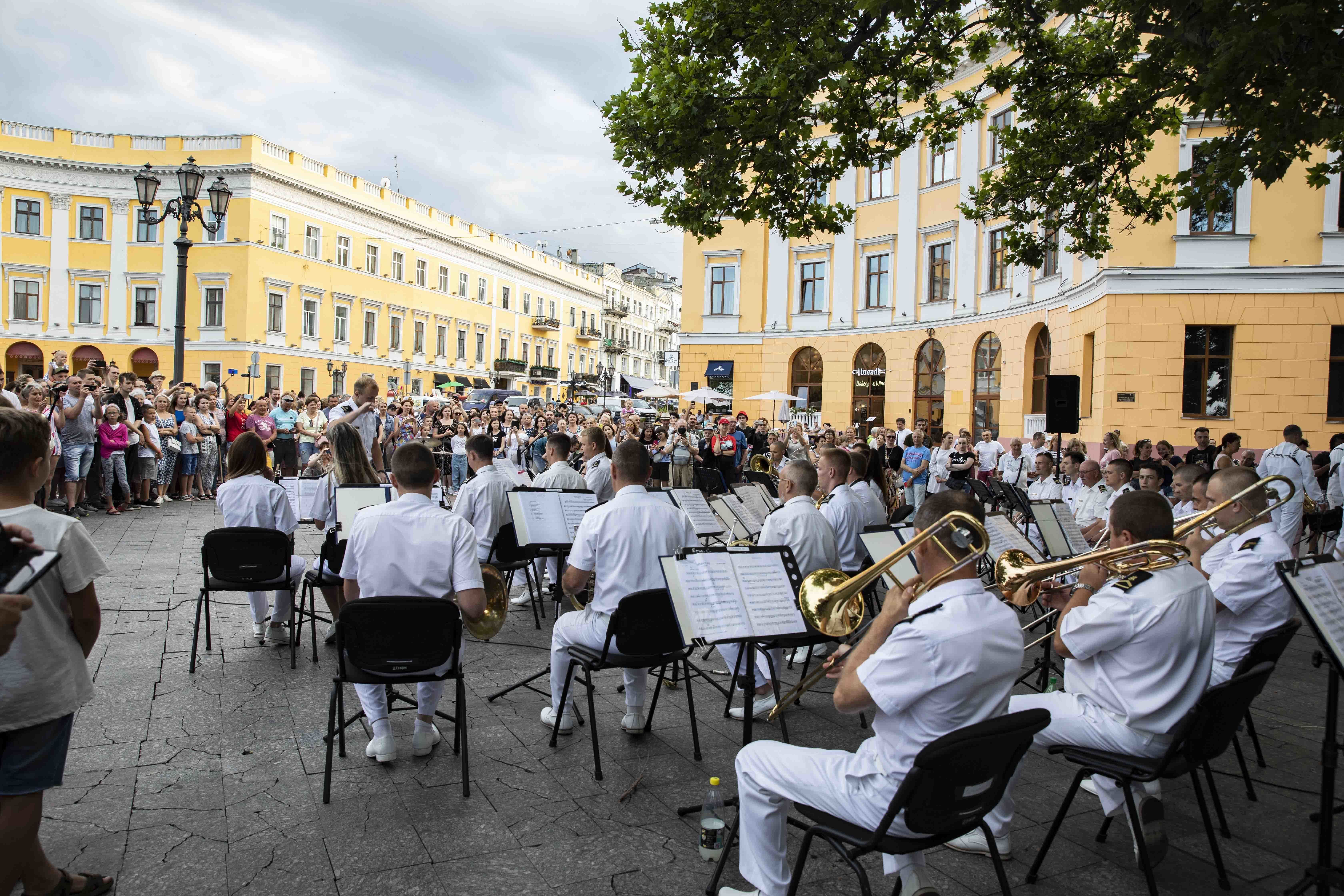 210707-N-BM428-0108 ODESA, Ukraine (July 7, 2021) The Ukrainian Navy Band plays at the Potemkin Stairs in Odesa, Ukraine during Exercise Sea Breeze 2021, July 7, 2021. Exercise Sea Breeze is a multinational maritime exercise cohosted by the U.S. Sixth Fleet and the Ukrainian Navy since 1997. Sea Breeze 2021 is designed to enhance interoperability of participating nations and strengthens maritime security and peace in the region. (U.S. Navy photo by Mass Communications Specialist 2nd Class Damon Grosvenor/Released)