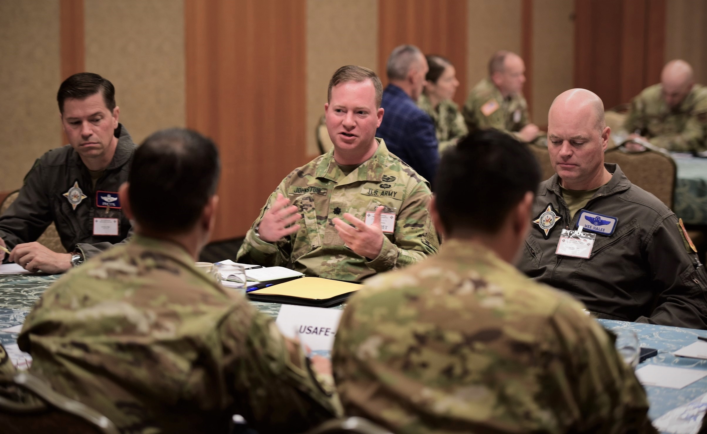 U.S. Army Lt. Col. Seth Johnston, a member of the Office of Defense Cooperation staff serving in Brussels, Belgium, talks about an upcoming activity with representatives from the U.S. Air Forces in Europe and Air Forces Africa training team during the U.S. European Command Strategic Implementation Conference held in Garmisch-Partenkirchen, Germany, from Aug. 21-25, 2023. U.S. European Command's Plans and Strategy directorate hosted the conference to bring together security cooperation experts from across the EUCOM region to discuss how to best engage and operate with Allies and partners to address shared security challenges.