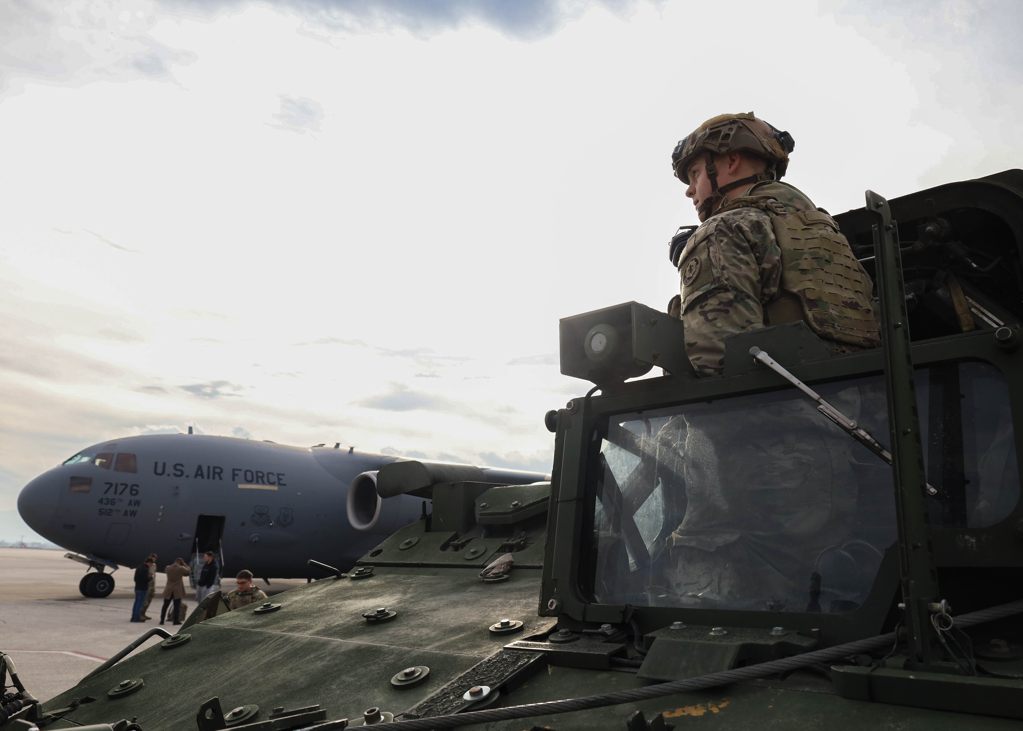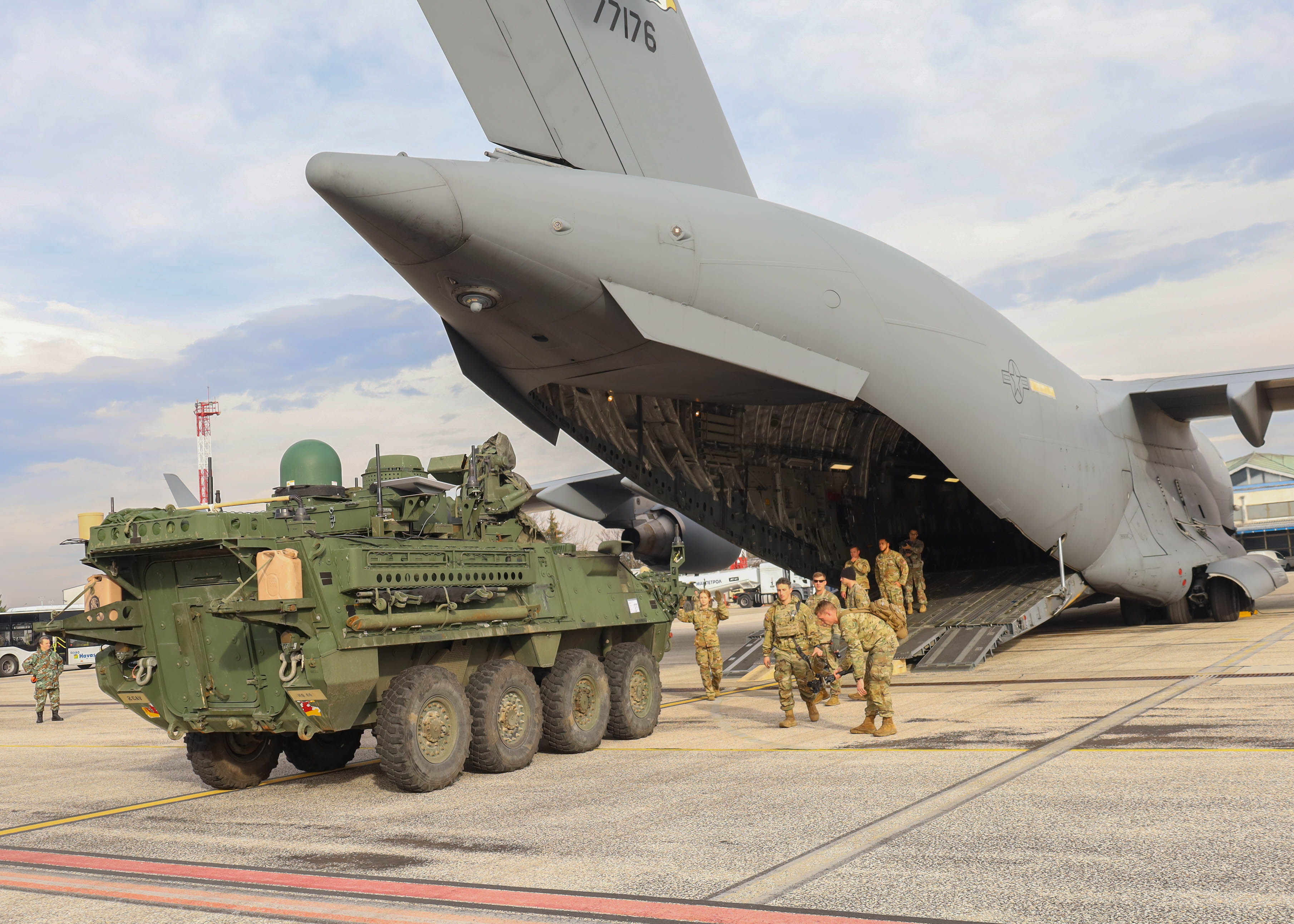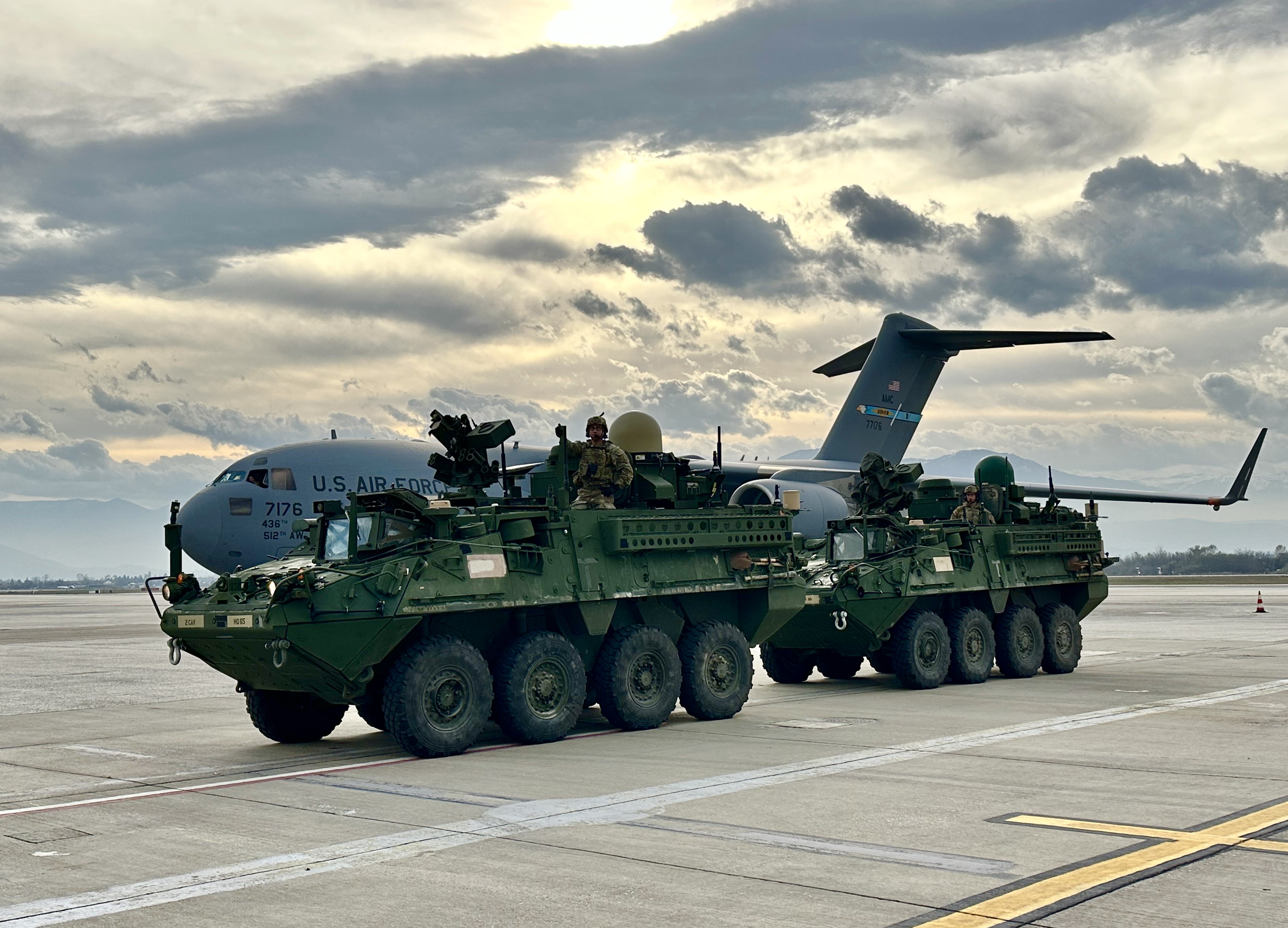 As part of USAREUR-AF’s Tactical Mission Data Platform, 2CR’s Stryker vehicles were a command post aboard a C-17 aircraft, demonstrating innovation and speed in exchanging information and tools between commanders en route in the sky and warfighters on the battlefield.