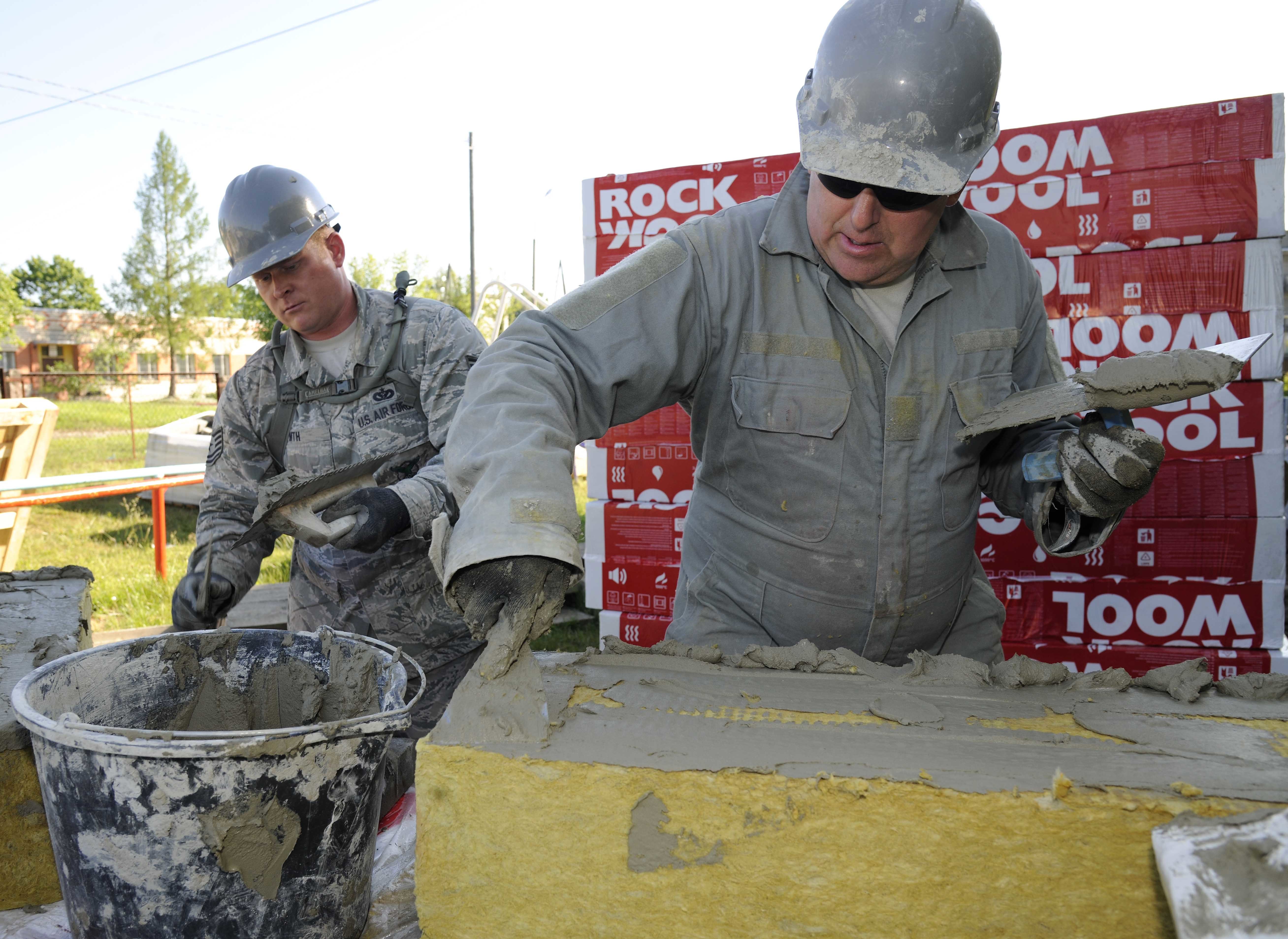 Staff Sgt. John Martin, 127th Civil Engineering Squadron pavements and construction supervisor and Tech. Sgt. Ed Hirth, 127th CES firefighter, apply a mud adhesive to rock wool insulation at a kindergarten in Silmala, Latvia on June 23, 2016. The school is currently undergoing a Humanitarian-civic assistance project to provide the school with up to date renovations. (U.S. Air National Guard photo by Senior Airman Ryan Zeski)