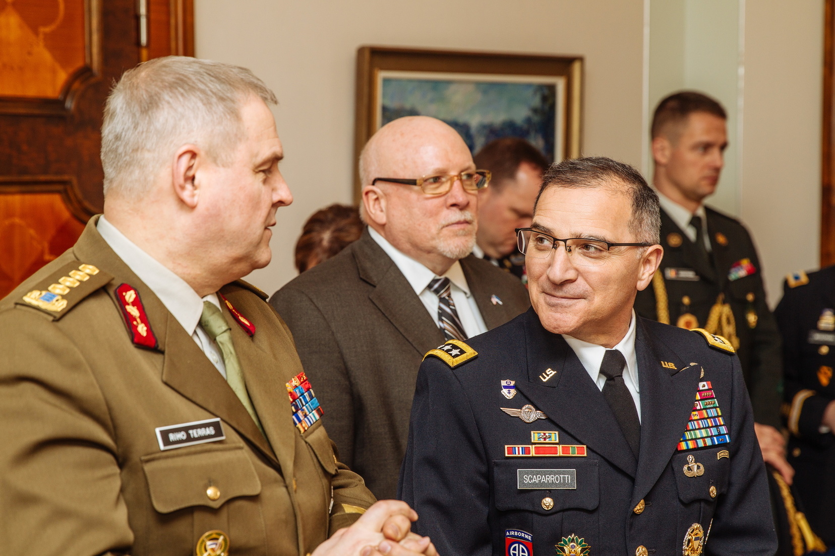 TALLINN, Estonia - GEN Curtis M. Scaparrotti, U.S. European Command, Commander (right) speaks with GEN Riho Terras, Chief of Defense, Estonia (left) prior to a press engagement Mar. 14, 2017. Scaparrotti's visit demonstrates EUCOM's support for the trans-Atlantic alliance and specifically the nations in the Baltic Region. (Courtesy photo)