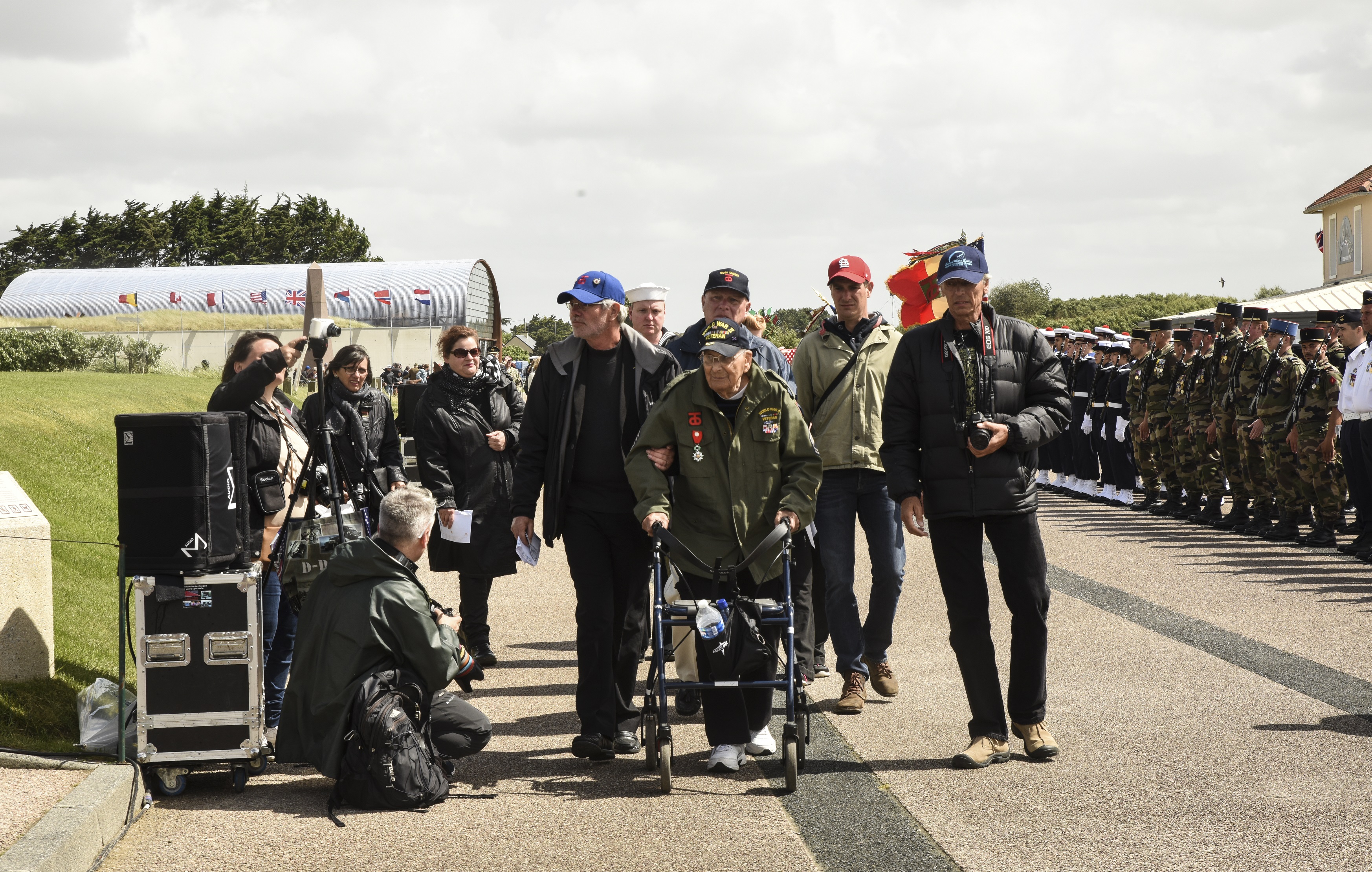 World War II veteran, Milton 'Milt' Staley, 98, is escorted into the Utah Beach wreath-laying ceremony, June 6, 2017 at Normandy, France. This ceremony commemorates the 73rd anniversary of D-Day, the largest multi-national amphibious landing and operational military airdrop in history, and highlights the U.S.’ steadfast commitment to European allies and partners. Overall, approximately 400 U.S. servicemembers from units in Europe and the U.S. are participating in ceremonial D-Day events from May 31 to June 7, 2017.