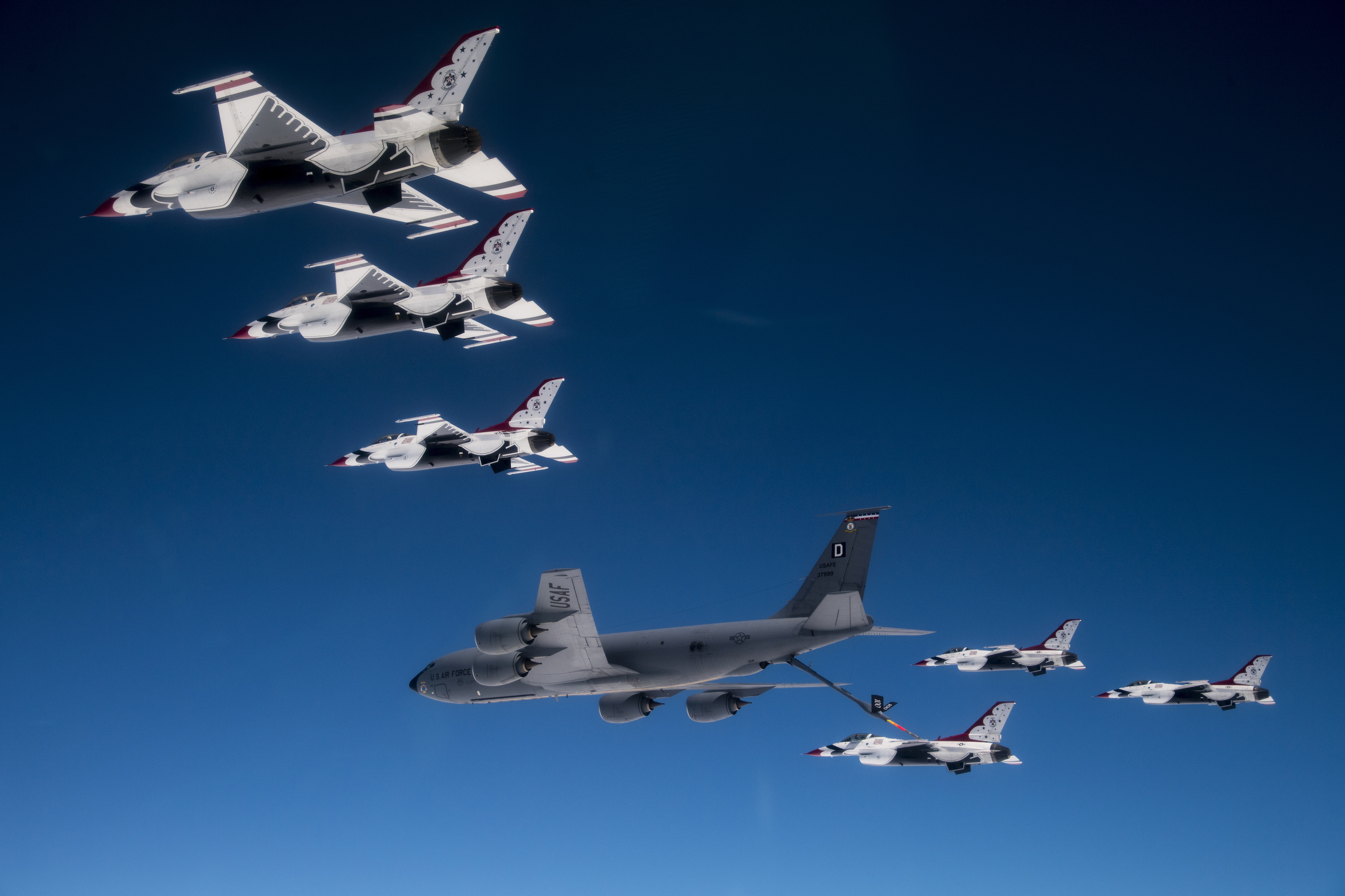 The U.S. Air Force Thunderbirds receive aerial refueling from a U.S. Air Force KC-135 Stratotanker assigned to the 100th Air Refueling Wing, Royal Air Force Mildenhall, England, July 11, 2017. (U.S. Air Force Photo by Tech. Sgt. Christopher Boitz)
