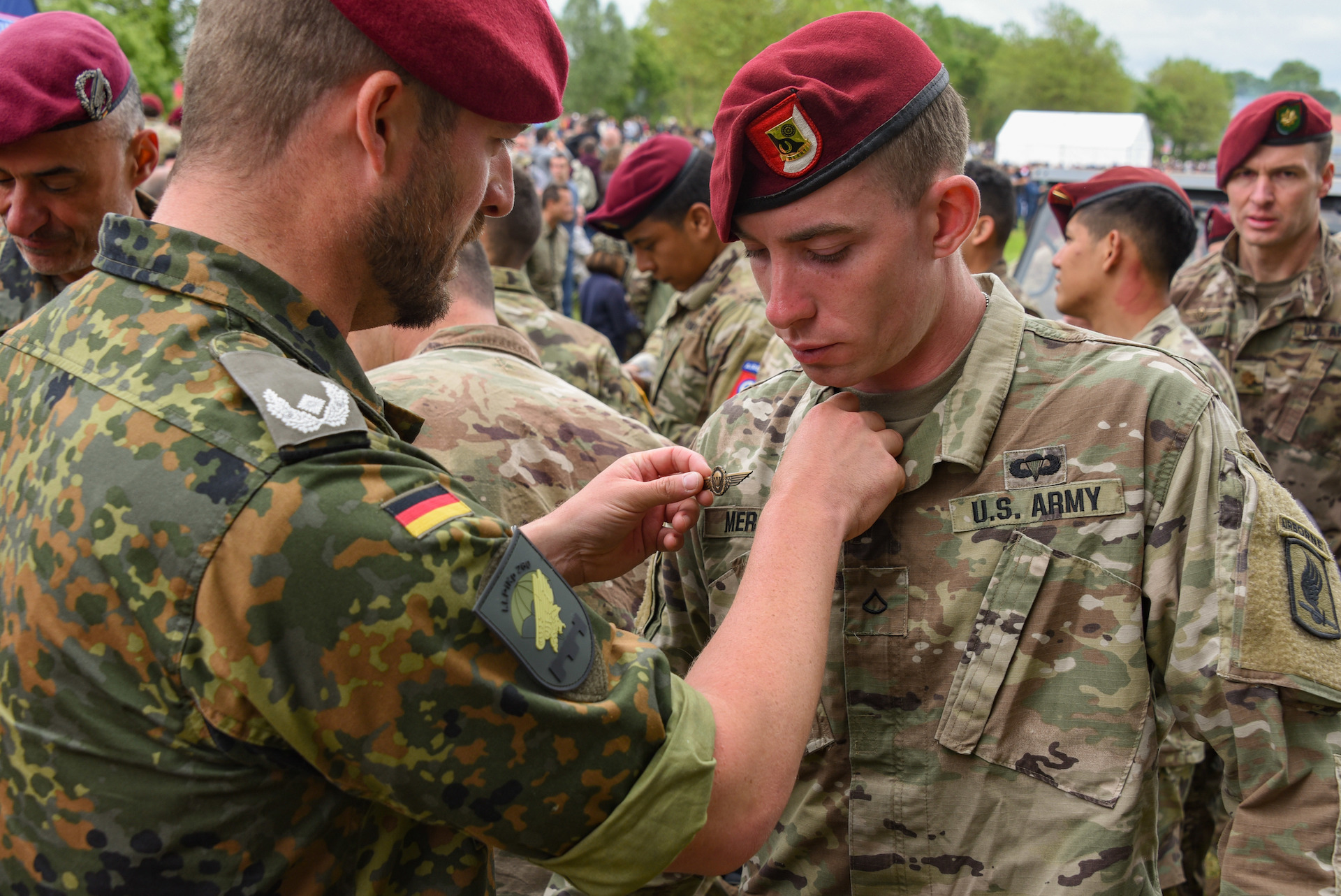 A German paratrooper presents German jumpwings to a U.S. Army paratrooper with 173rd Airborne Brigade after a multinational airborne operation near Saint-Mere-Eglise, France, June 9, 2019. Over 950 military paratroopers from seven countries participate in a commemorative airborne operation. This operation is an opportunity for multinational forces to honor the past and simultaneously work to secure the future. More than 1,300 U.S. Service Members, partnered with 950 troops from across Europe and Canada, have converged in northwestern France to commemorate the 75th anniversary of Operation Overlord, the WWII Allied invasion of Normandy, commonly known as D-Day. Upwards of 80 ceremonies in 40 French communities in the region will take place between June 1-9, 2019. (U.S. Army photo by Markus Rauchenberger)