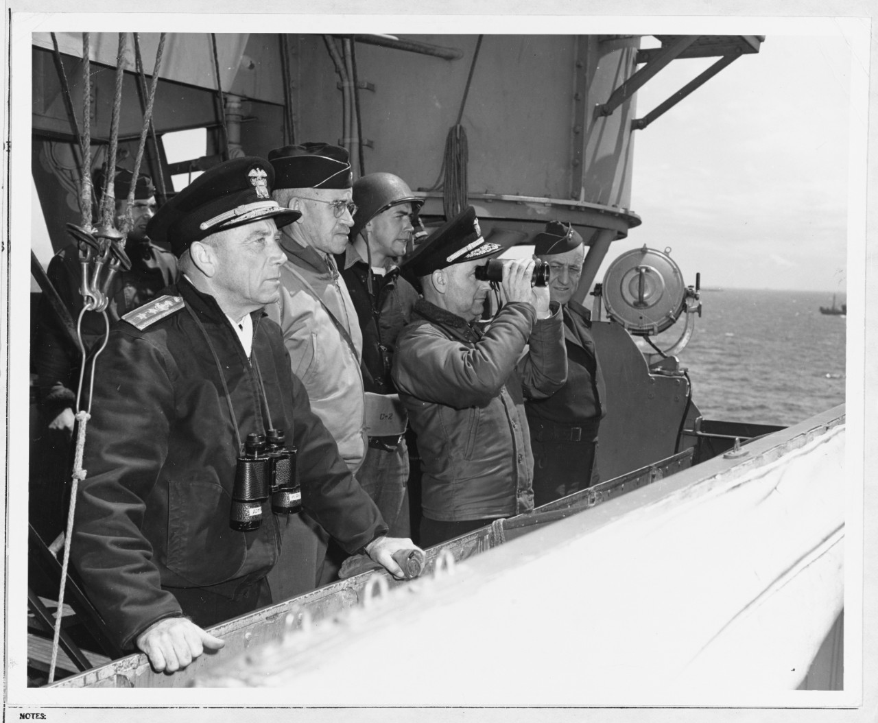 Senior U.S. officers watch operations from the bridge of USS Augusta (CA 31) off Normandy, June 8, 1944. They are from left to right: Commander Western Naval Task Force Rear Adm. Alan G. Kirk; Commanding General, U.S. First Army Lt. Gen. Omar N. Bradley; Chief of Staff Rear Adm. Arthur D. Struble; and Army Maj. Gen. Ralph Royce. (Photo by U.S. Navy/National Archives)