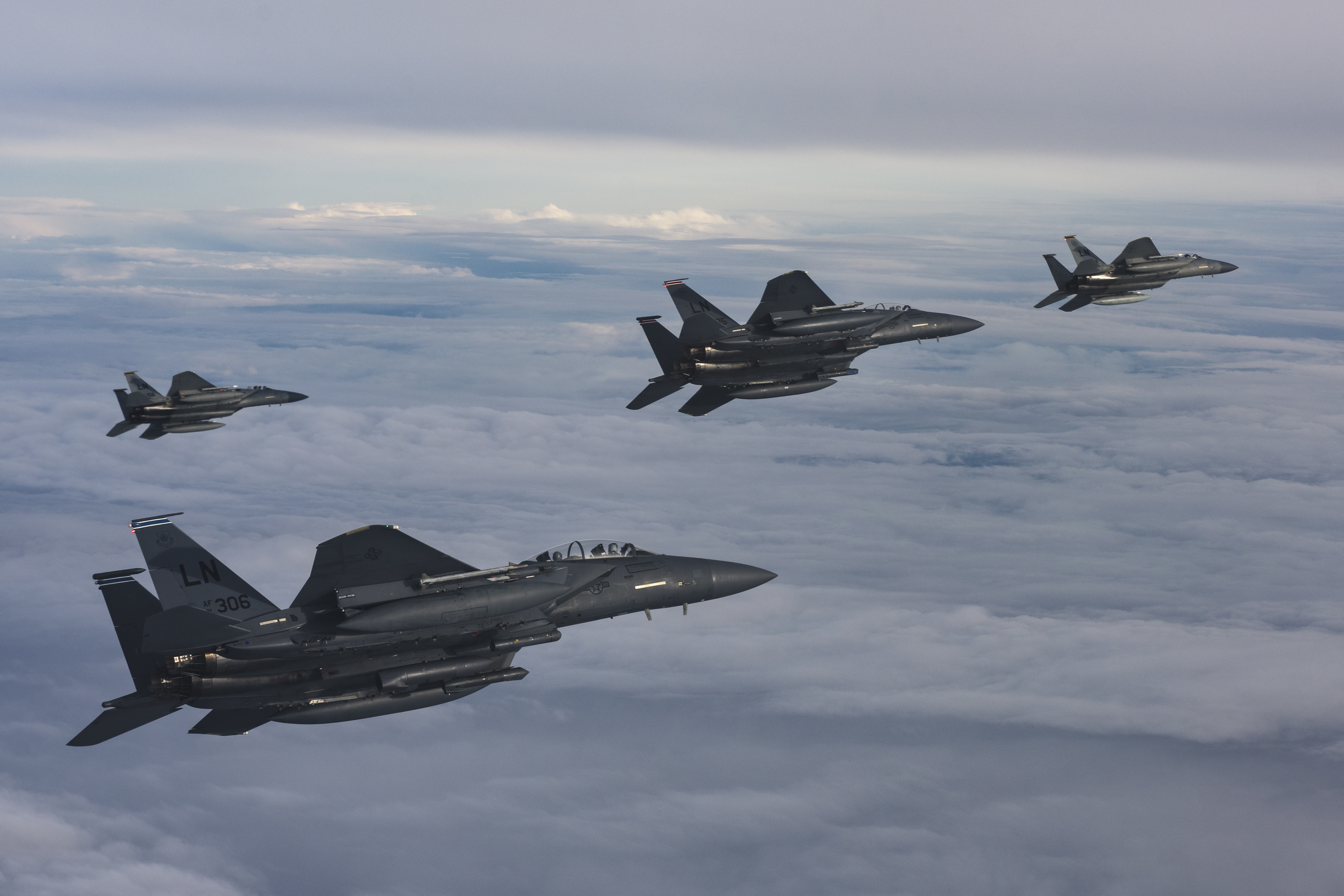 U.S. Air Force F-15C Eagles and F-15E Strike Eagles assigned to the 48th Fighter Wing conduct aerial operations in support of exercise Point Blank 19-8, over the North Sea, Nov. 14, 2019. The purpose of Point Blank is to exercise large force capabilities that incorporate current and future wartime scenarios. This iteration is especially unique in that it features special operations forces and the ‘Iron Triad’. (U.S. Air Force photo/ Staff. Sgt. Rachel Maxwell)