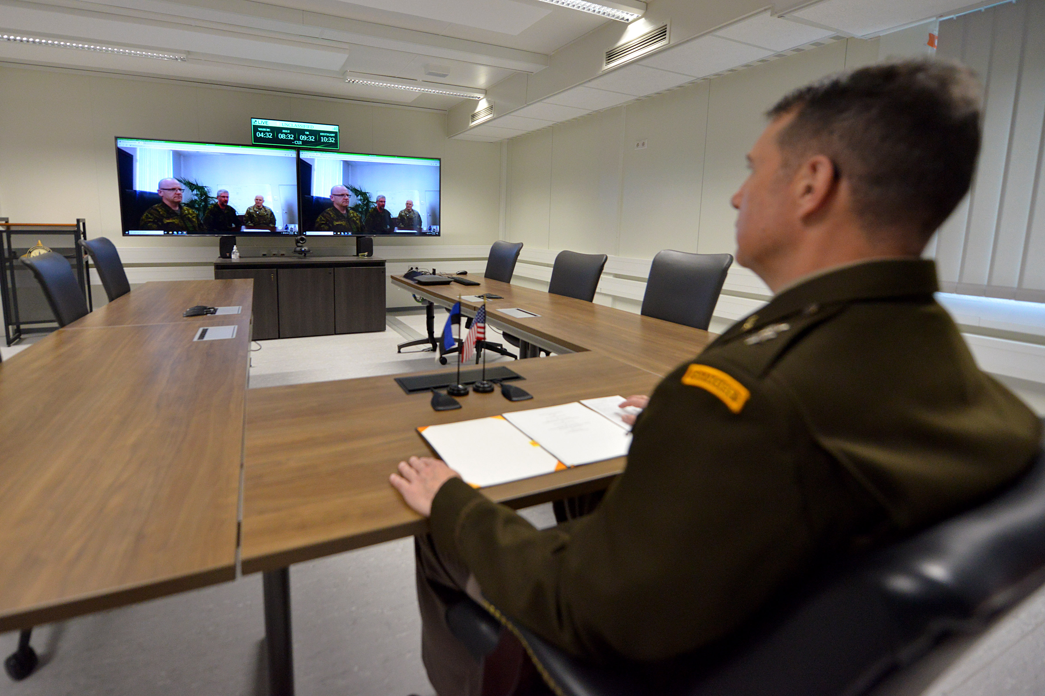 U.S. Army Maj. Gen. Charles Miller, U.S. European Command’s director of plans, policy, strategy and capabilities, participates in a virtual signing ceremony May 11, 2021. USEUCOM and Estonian officials signed an agreement to establish an Estonian liaison officer at the USEUCOM headquarters in Stuttgart, Germany beginning this summer.