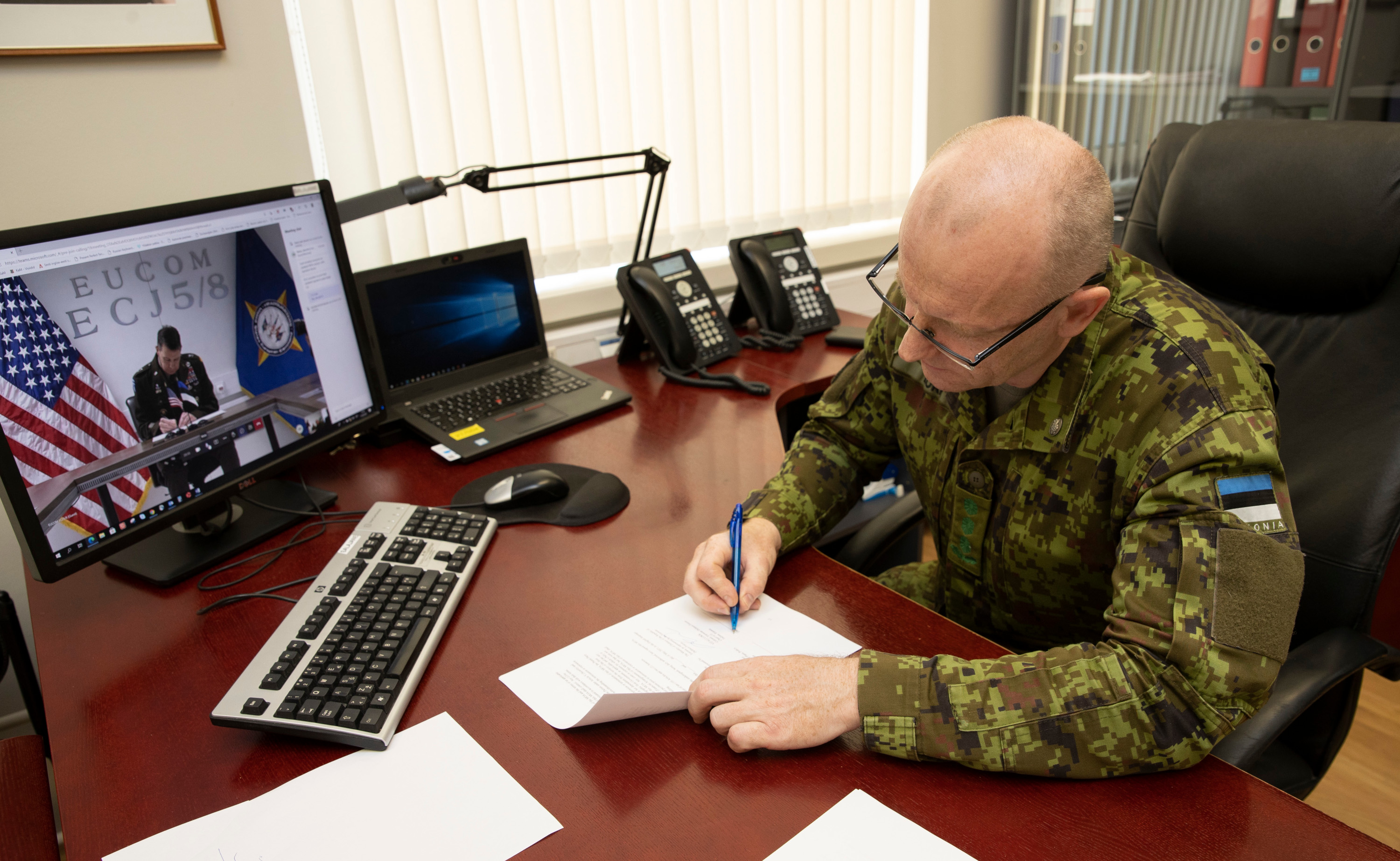 Col. Vitali Lokk, chief of personnel department of the headquarters of the Estonian Defense Forces, signs an agreement to establish an Estonian liaison officer on the U.S. European Command headquarters staff during a virtual signing ceremony May 11, 2021. Liaison officers serve an important role at the command and help synchronize planning efforts between USEUCOM and their home nations.