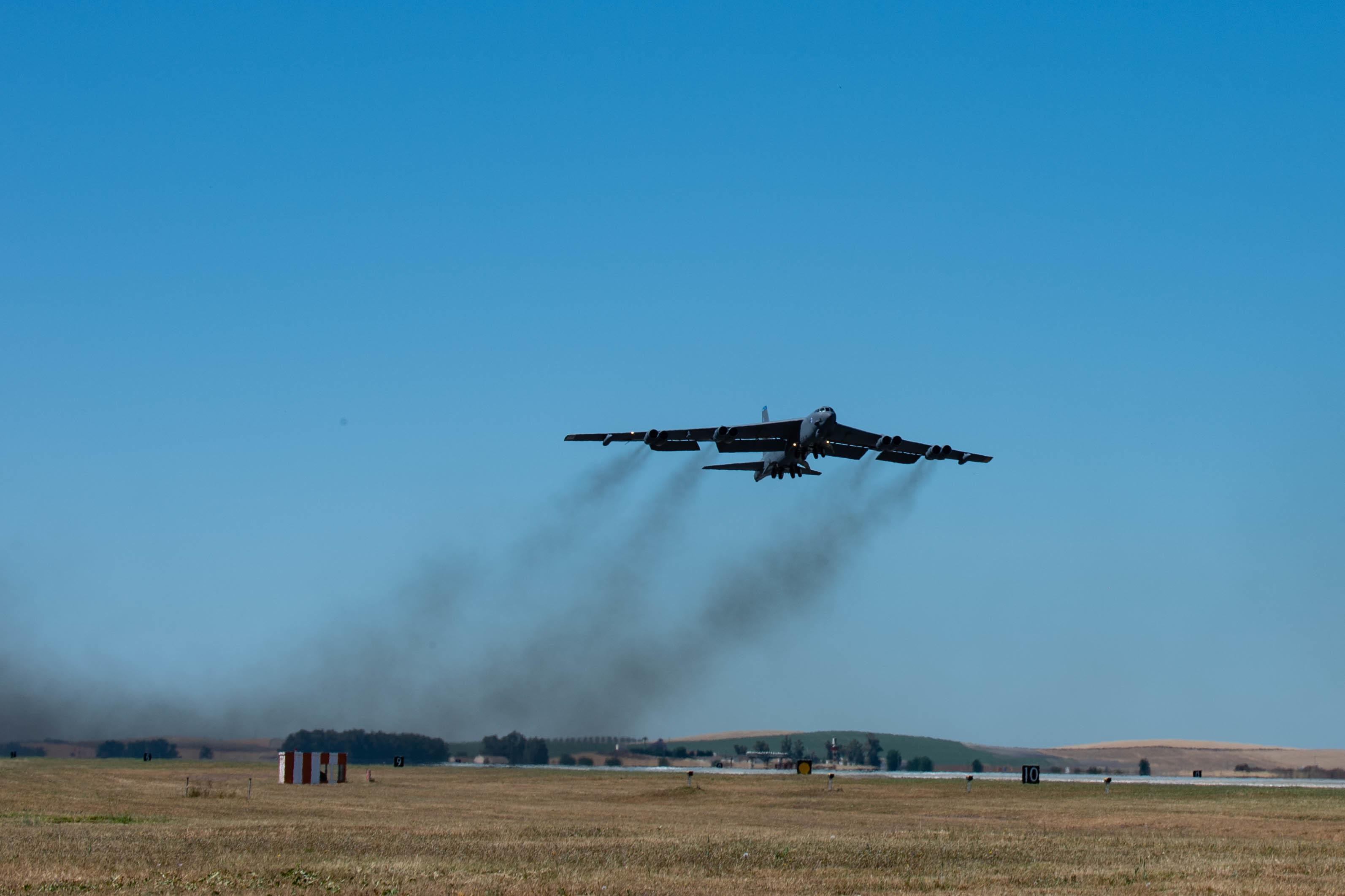 A B-52H Stratofortress, assigned to the 2nd Bomb Wing, Barksdale Air Force Base, Louisiana, takes off from Morón Air Base, Spain, May 9, 2021, in support of strategic Bomber Task Force operations across Europe. Strategic bomber missions routinely operate across the globe and are flexible and agile to respond to the changes in the operational environment. (U.S. Air Force photo by 2d Lieutenant Aileen Lauer)