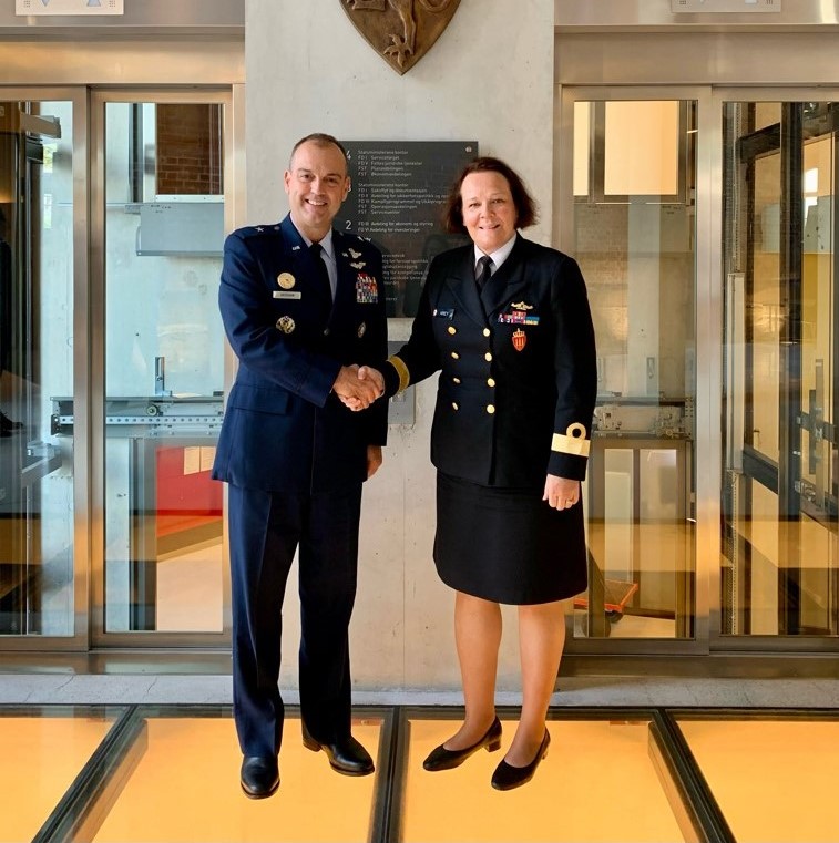 Norwegian Royal Navy Rear Adm. Solveig Krey, Norwegian Defence Staff's chief of operations, and co-chair of the Arctic Security Forces Roundtable, shakes hands with her counterpart, Brig. Gen. Edward Vaughan, the U.S. European Command deputy director for security cooperation, policy, partnering and space. (USEUCOM photo by CPT Sarah Kramer)