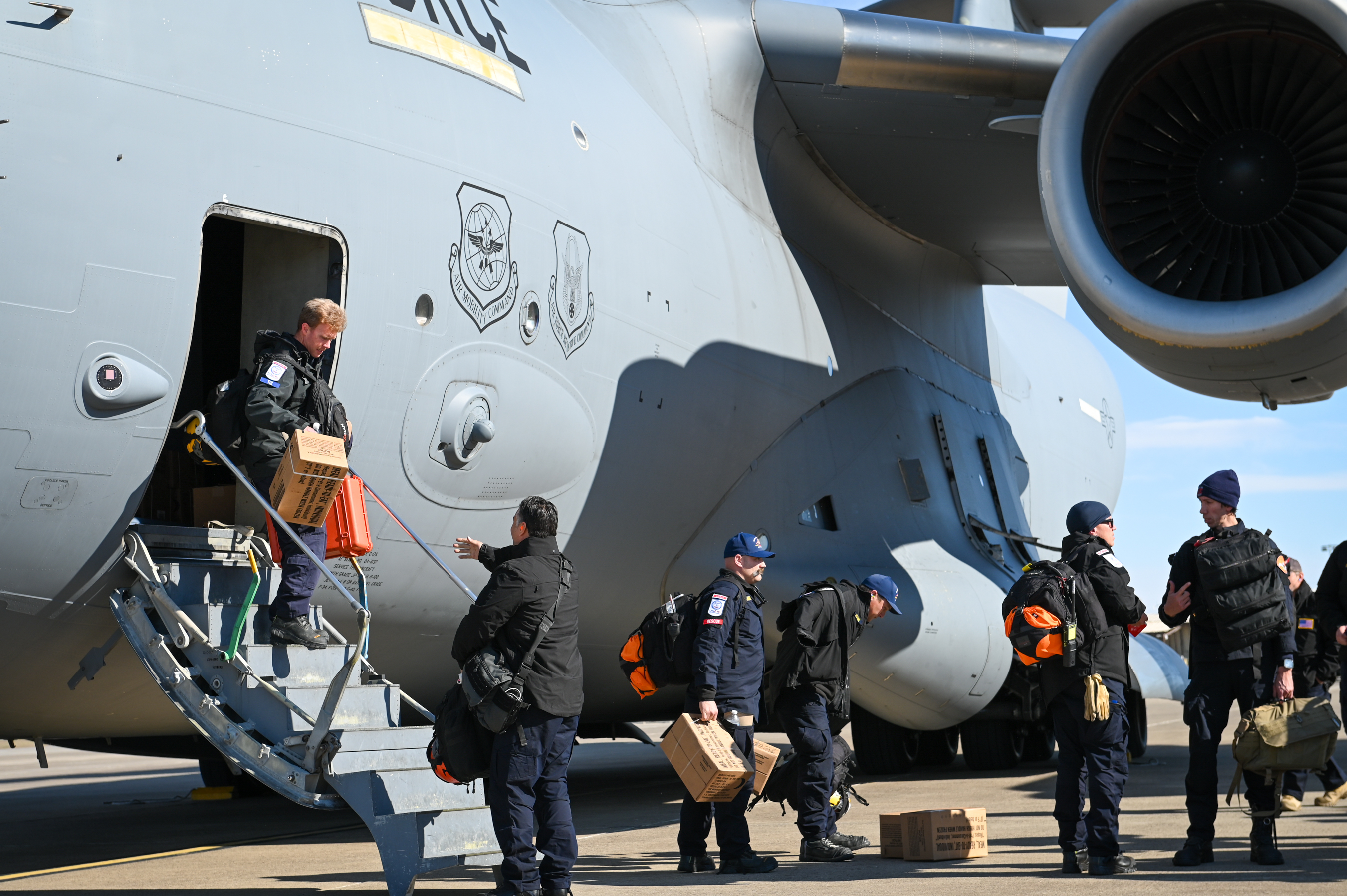 Members of the United States Agency for International Development’s Disaster Assistance Response Team unload cargo at Incirlik Air Base, Türkiye, Feb. 8, 2023. The DART is assigned to lead the U.S. government humanitarian response following a series of earthquakes that struck central-southern Türkiye on Feb. 6, 2023. The DART includes urban search and rescue teams from the Fairfax and Los Angeles County Fire Departments and include 159 people, 12 rescue dogs and 170,000 pounds of specialized equipment. (U.S. Air Force photo by Senior Airman Joshua T. Crossman)