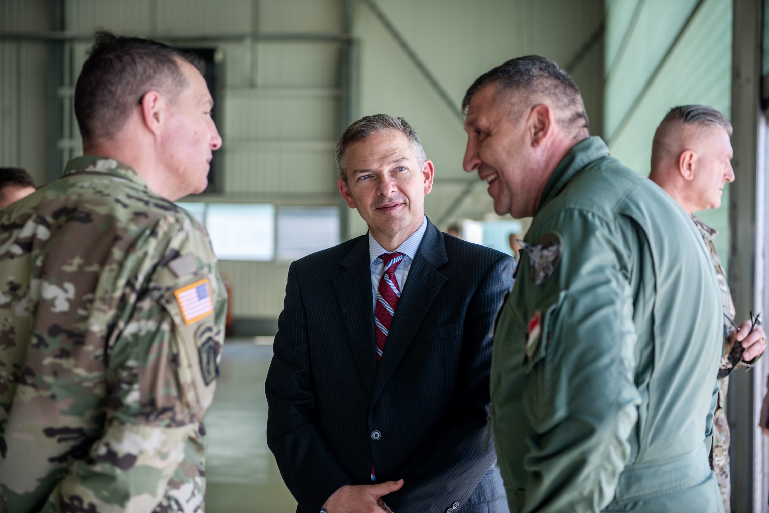 Major General Charles Miller, USEUCOM Director of Plans, Policy, Strategy and Capabilities, left, Marc Dillard, Chargé d'Affaires, U.S. Embassy Budapest, center, and Hungarian Brig. Gen. Csaba Ugrik, Kecskemét Air Base commander, Hungarian Defence Force, right, speak during a signing ceremony of two implementing agreements that allow American forces access and use of two air bases in Hungary July 16, 2021.