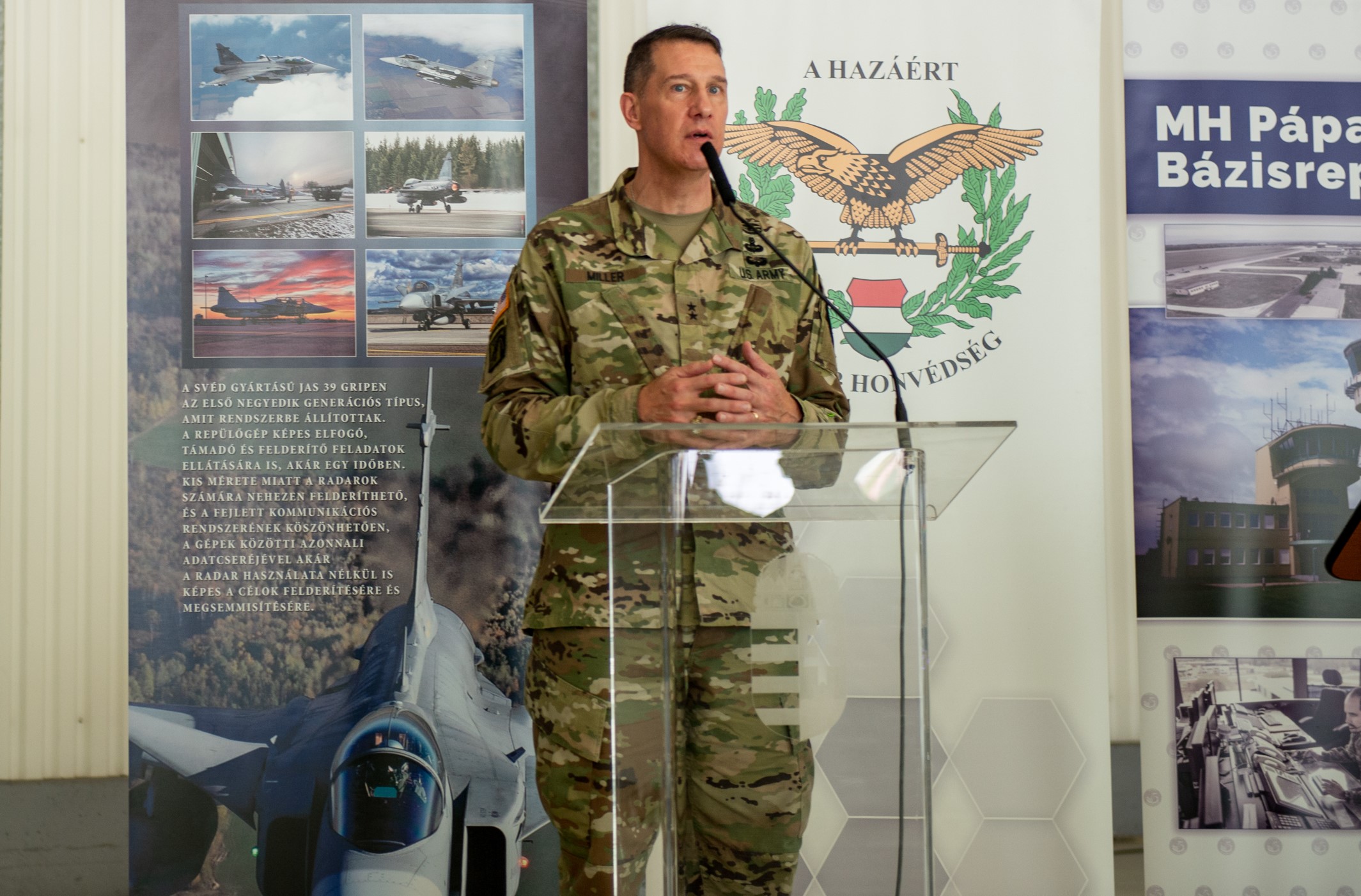 Major General Charles Miller, USEUCOM Director of Plans, Policy, Strategy and Capabilities, gives remarks during a signing ceremony July 16, 2021. The U.S. and Hungary signed implementing agreements that allow American forces access and use of two air bases in Hungary. The agreements are an important step to fully implementing the Defense Cooperation Agreement between the U.S. and Hungary signed in 2019.