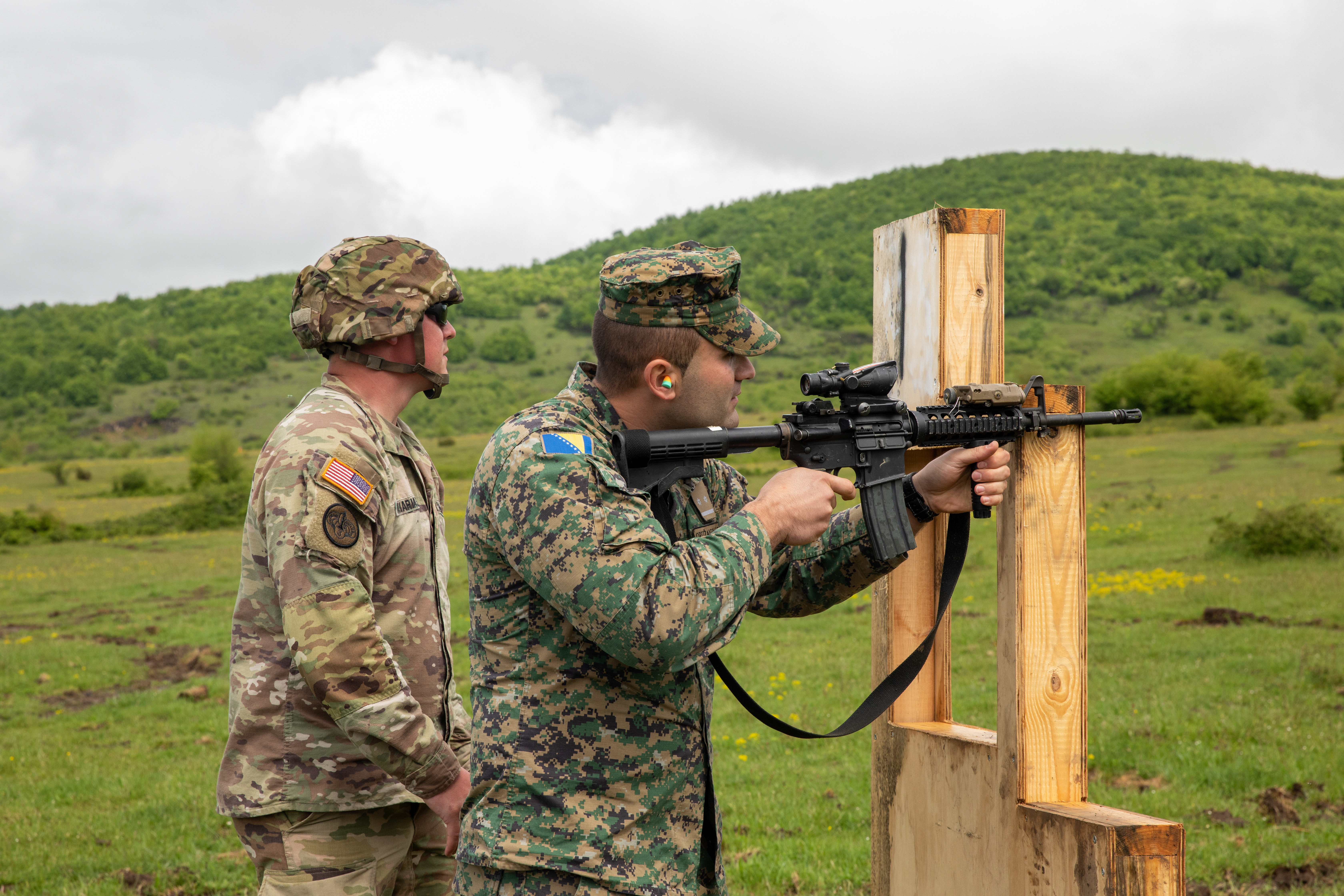U.S. Army Staff Sgt. Justin Sachariason (left), a Soldier assigned to the Florida Army National Guard’s 2nd Battalion, 124th Infantry Regiment, 53rd Infantry Brigade Combat Team, instructs 1st Lt. Almir Sarač, a Soldier with the Armed Forces of Bosnia and Herzegovina (AFBiH), on how to shoot the M4A1 Carbine rifle at Manjača Training Area, Bosnia and Herzegovina (BiH), May 19, 2021. The 2-124th was in BiH for Immediate Response 21, a training exercise with approximately 500 members of the AFBiH and about 700 U.S. Soldiers working side by side to enhance alliance security while maintaining a broad range of military capabilities to deter aggression and assure readiness. Immediate Response 21 is a DEFENDER-Europe 21-linked exercise that integrates approximately 28,000 multinational forces from 26 nations to conduct nearly simultaneous operations across more than 30 training areas in 12 countries.