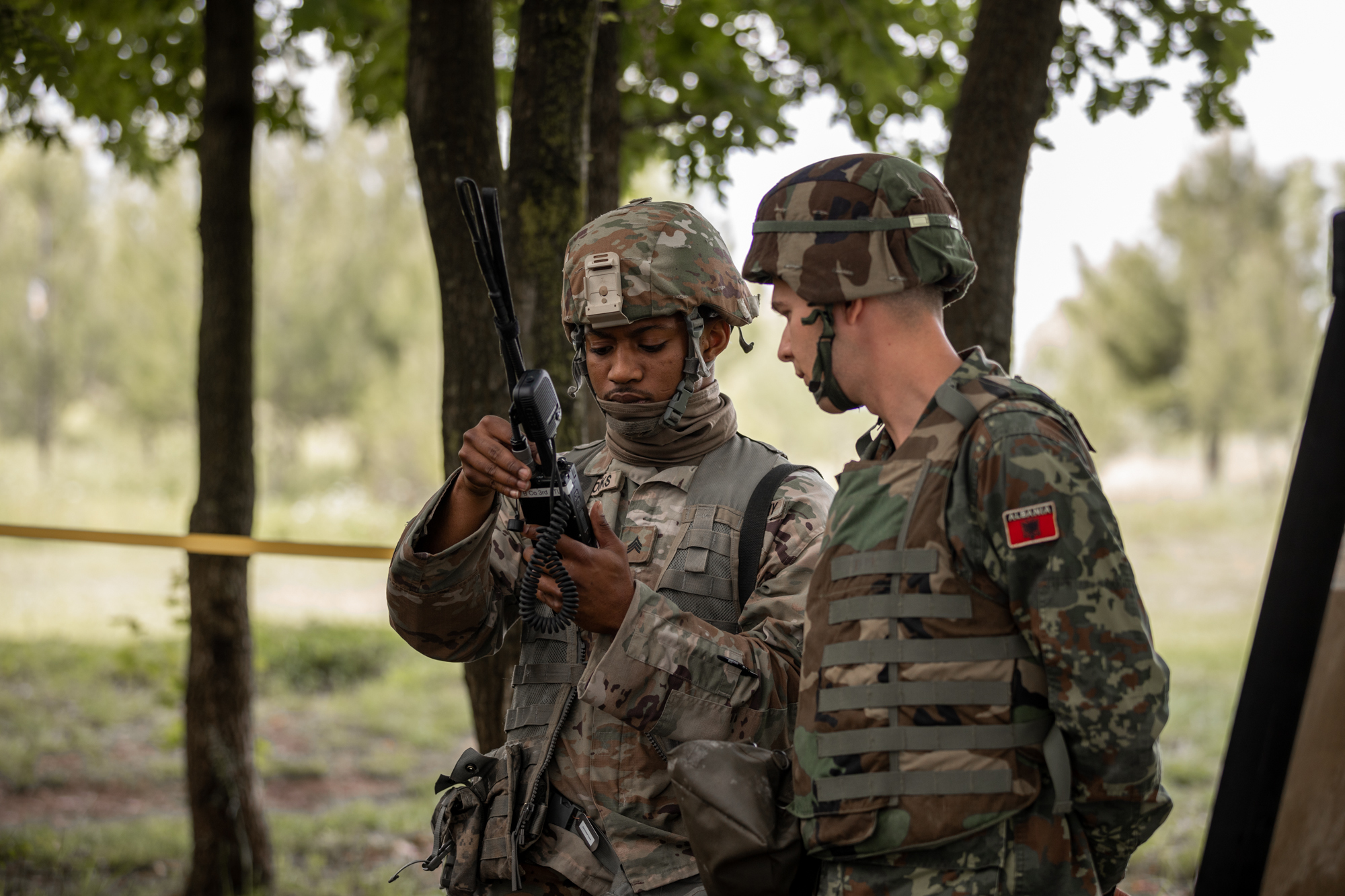 A Soldier from the Florida Army National Guard shows an Albanian cadet how to program a radio during DEFENDER-Europe 21-linked exercise Immediate Response, Tuesday, May 18, 2021. DEFENDER-Europe 21 is a large-scale U.S. Army-led exercise designed to build readiness and interoperability between the U.S., NATO allies and partner militaries. This year, more than 28,000 multinational forces from 26 nations conducted nearly simultaneous operations across more than a dozen countries from the Baltics to the strategically important Balkans and Black Sea Region.