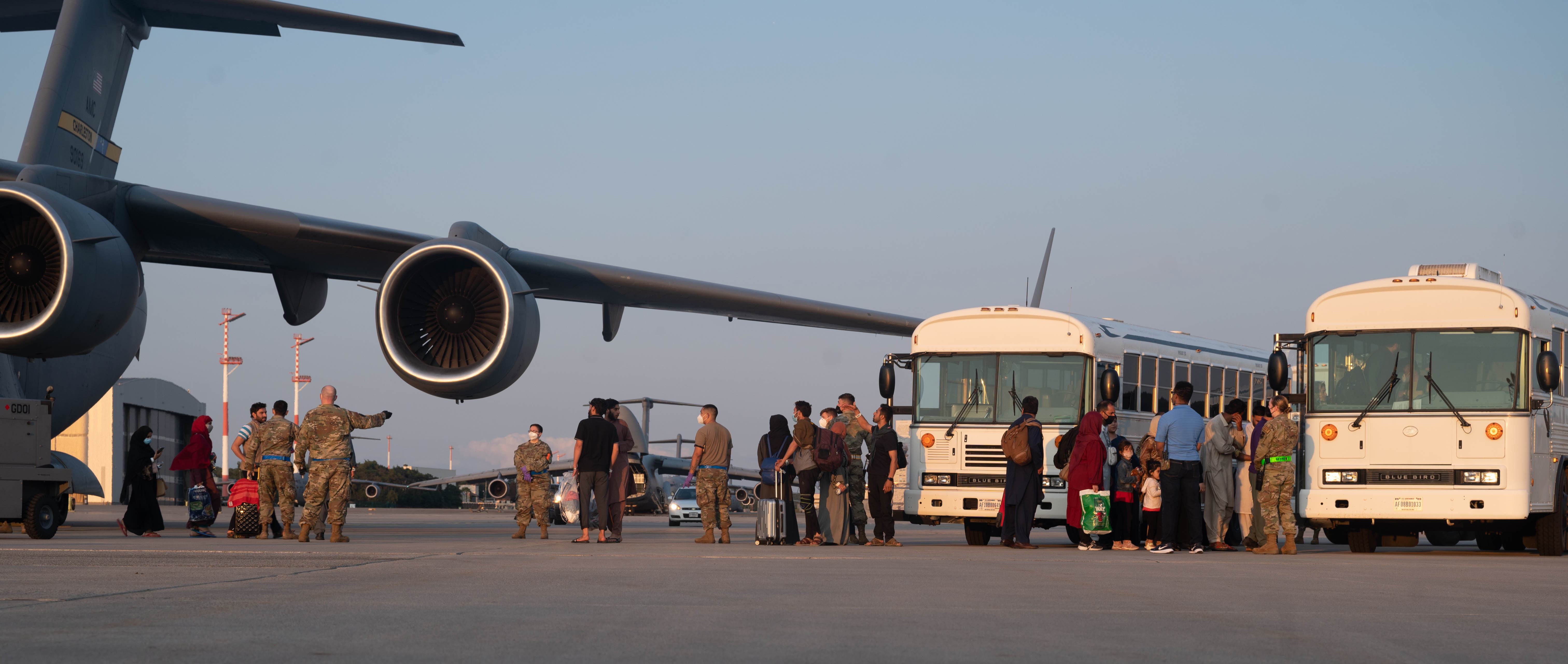 A group of Afghan evacuees depart a C-17 Globemaster III aircraft at Ramstein Air Base, Germany, Aug. 20, 2021. Ramstein Air Base is providing safe, temporary lodging for qualified evacuees from Afghanistan as part of Operation Allies Refuge during the next several weeks. Operation Allies Refuge is facilitating the quick, safe evacuation of U.S. citizens, Special Immigrant Visa applicants and other at-risk Afghans from Afghanistan. Qualified evacuees will receive support such as temporary lodging, food, medical screening, treatment and more at Ramstein Air Base while preparing for onward movements to their final destination. (U.S. Air Force photo by Senior Airman Taylor Slater)