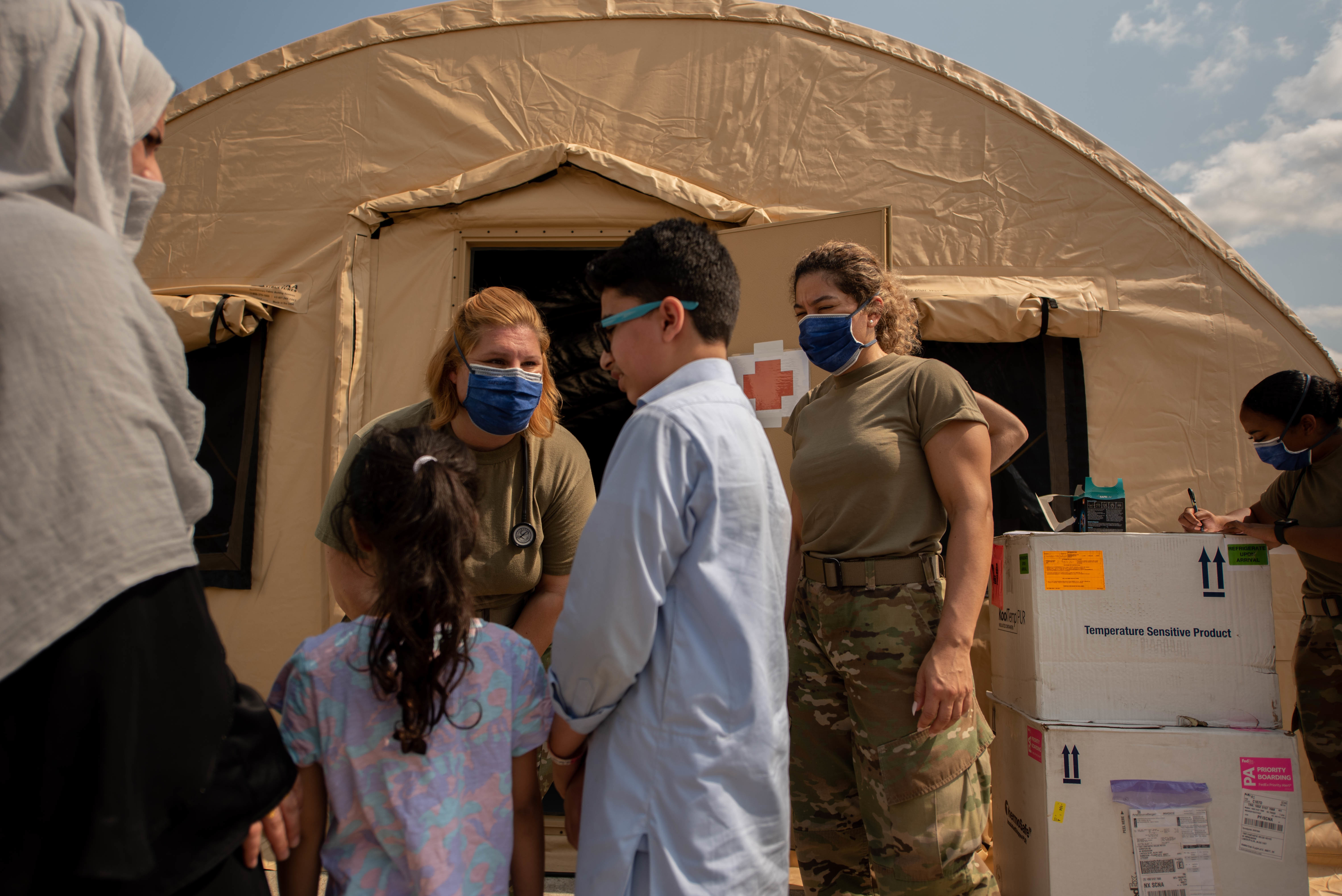 U.S. Air Force medical technicians speak with Afghan evacuees at Ramstein Air Base, Germany, Aug. 21, 2021. Ramstein Air Base is providing safe, temporary lodging for evacuees from Afghanistan as part of Operation Allies Refuge during the next several weeks. Operation Allies Refuge is facilitating the quick, safe evacuation of U.S. citizens, Special Immigrant Visa applicants and other at-risk Afghans from Afghanistan. Evacuees will receive support, such as temporary lodging, food, medical screening, treatment and more at Ramstein Air Base while preparing for onward movements to their final destination. (U.S. Air Force photo by Senior Airman Manuel Zamora)