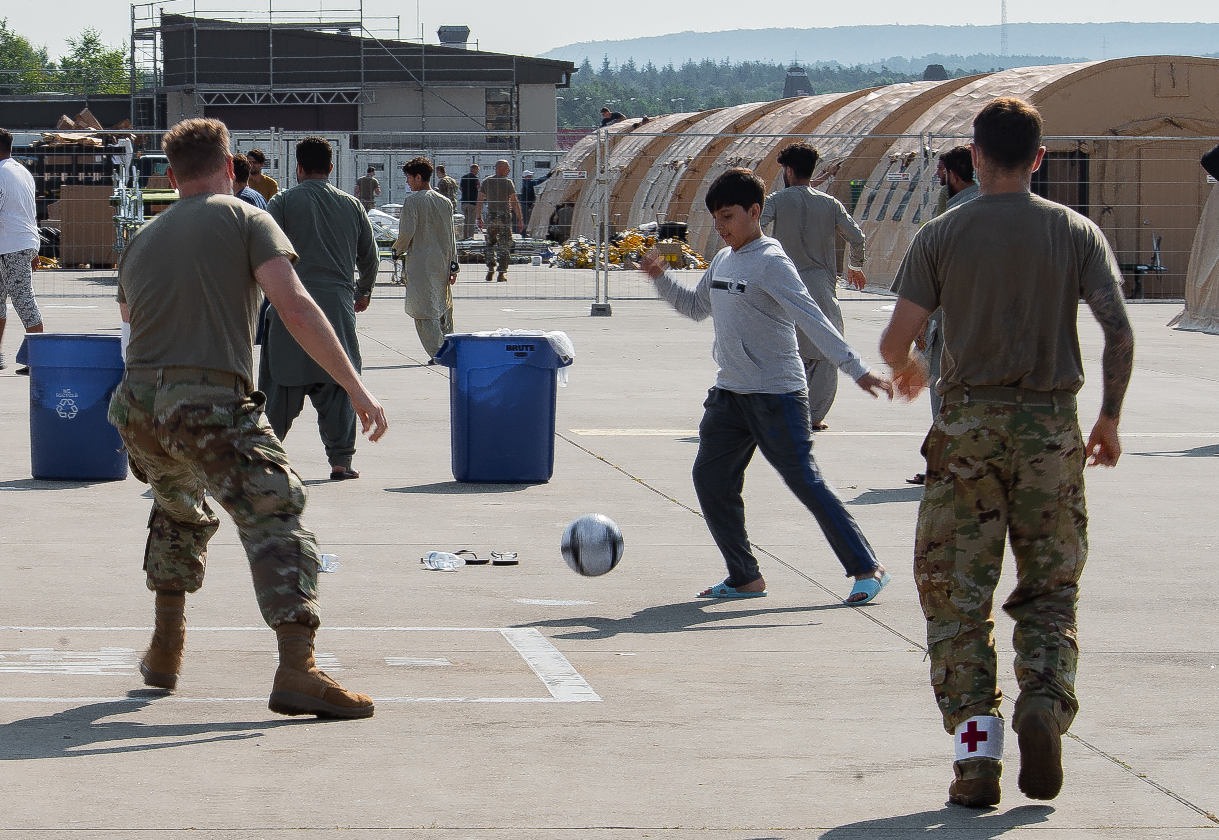 U.S. Air Force Airmen play soccer with Afghan evacuees at Ramstein Air Base, Germany, Aug. 21, 2021. Ramstein Air Base is providing safe, temporary lodging for evacuees from Afghanistan as part of Operation Allies Refuge. This operation is facilitating the quick, safe evacuation of U.S. citizens, Special Immigrant Visa applicants, and other at-risk Afghans from Afghanistan. Evacuees will receive support, such as temporary lodging, food and water and access to medical care as well as religious care at Ramstein Air Base while preparing for onward movements to their final destinations. (U.S. Air Force photo by Airman Edgar Grimaldo)