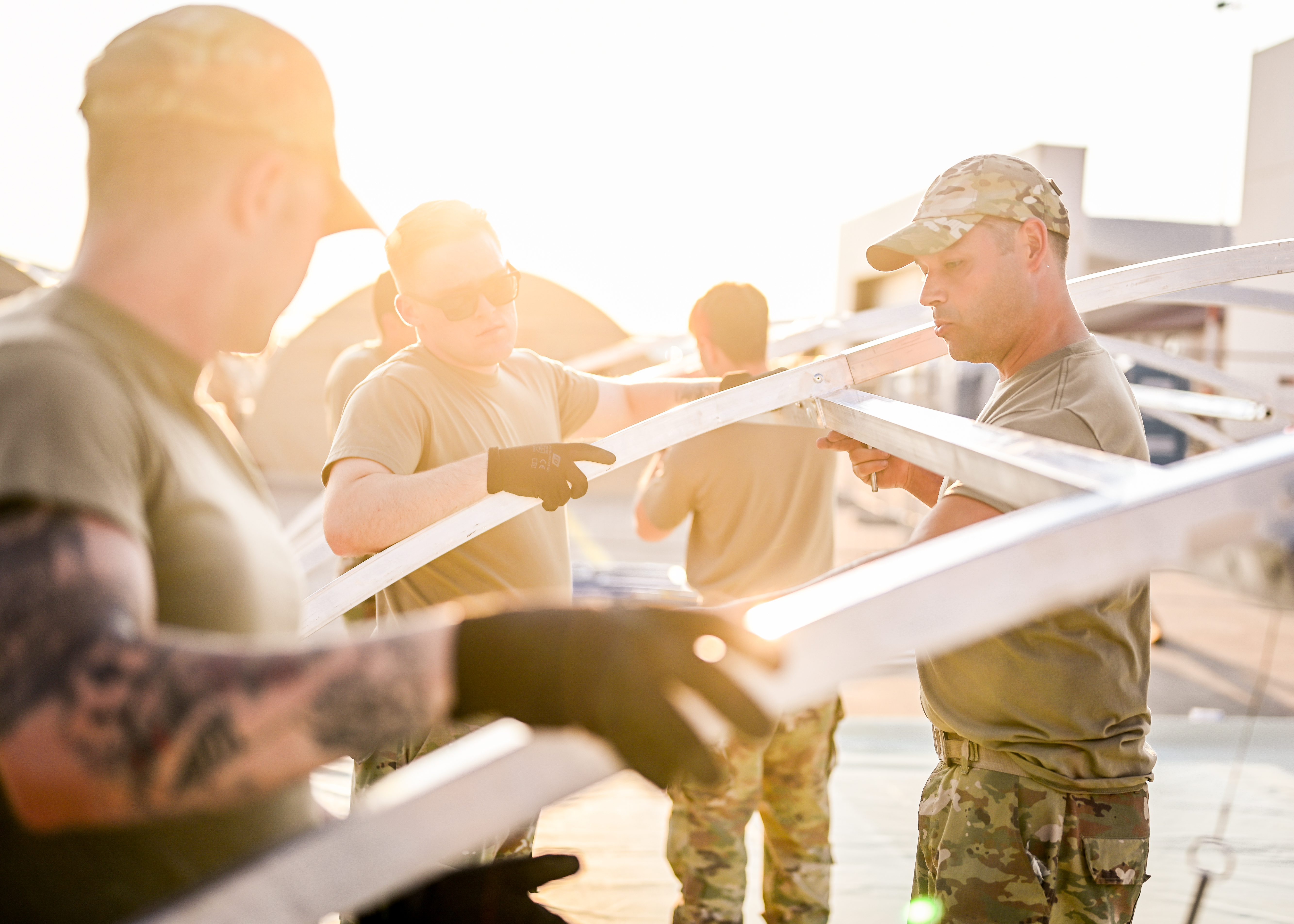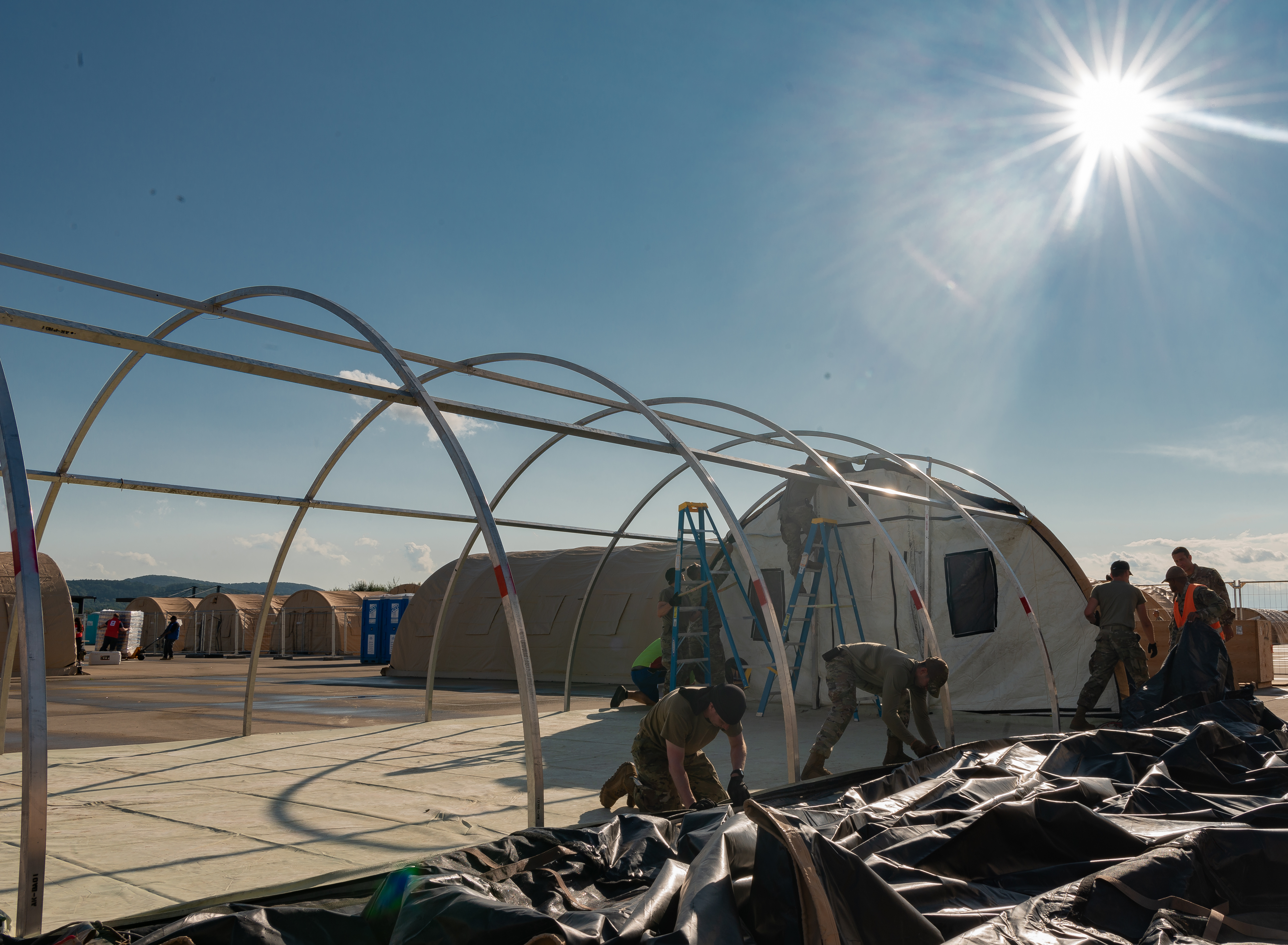 U.S. Airmen assigned to the 86th Civil Engineer Group set up pods as part of Operation Allies Refuge at Ramstein Air Base, Germany, Aug. 22, 2021. Ramstein is providing temporary lodging to qualified evacuees from Afghanistan while they await onward transportation. (U.S. Air Force photo by Airman Edgar Grimaldo)