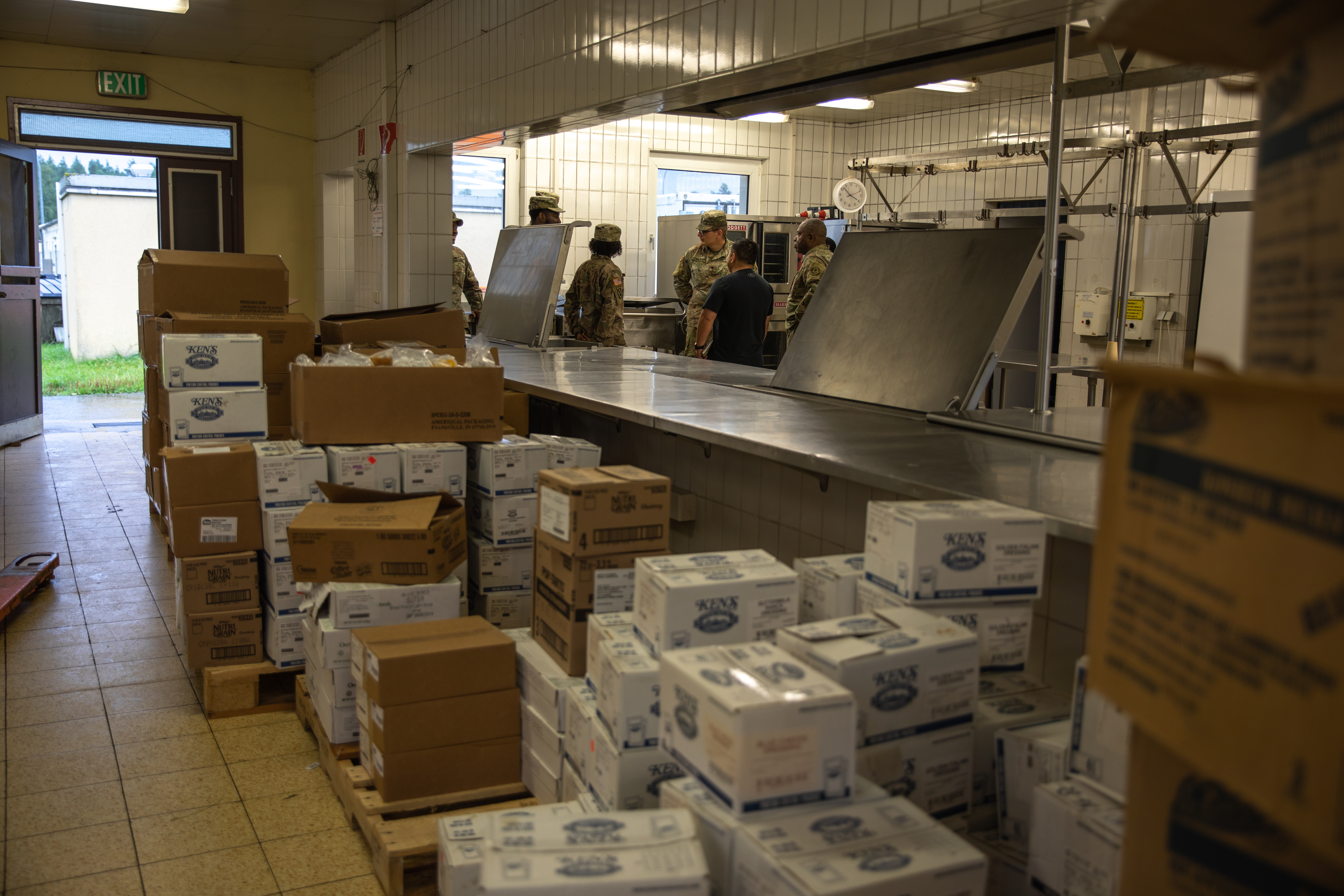 U.S. Soldiers assigned to 7th Army Training Command’s units prepare a dining facility for the possibility of supporting transient Afghan evacuees at Grafenwoehr Training Area, Germany, Aug. 22, 2021. U.S. Army Europe and Africa is working hand-in-hand with host nations, the joint force and interagency partners to provide temporary lodging, medical and logistical support as part of Operation Allies Refuge.