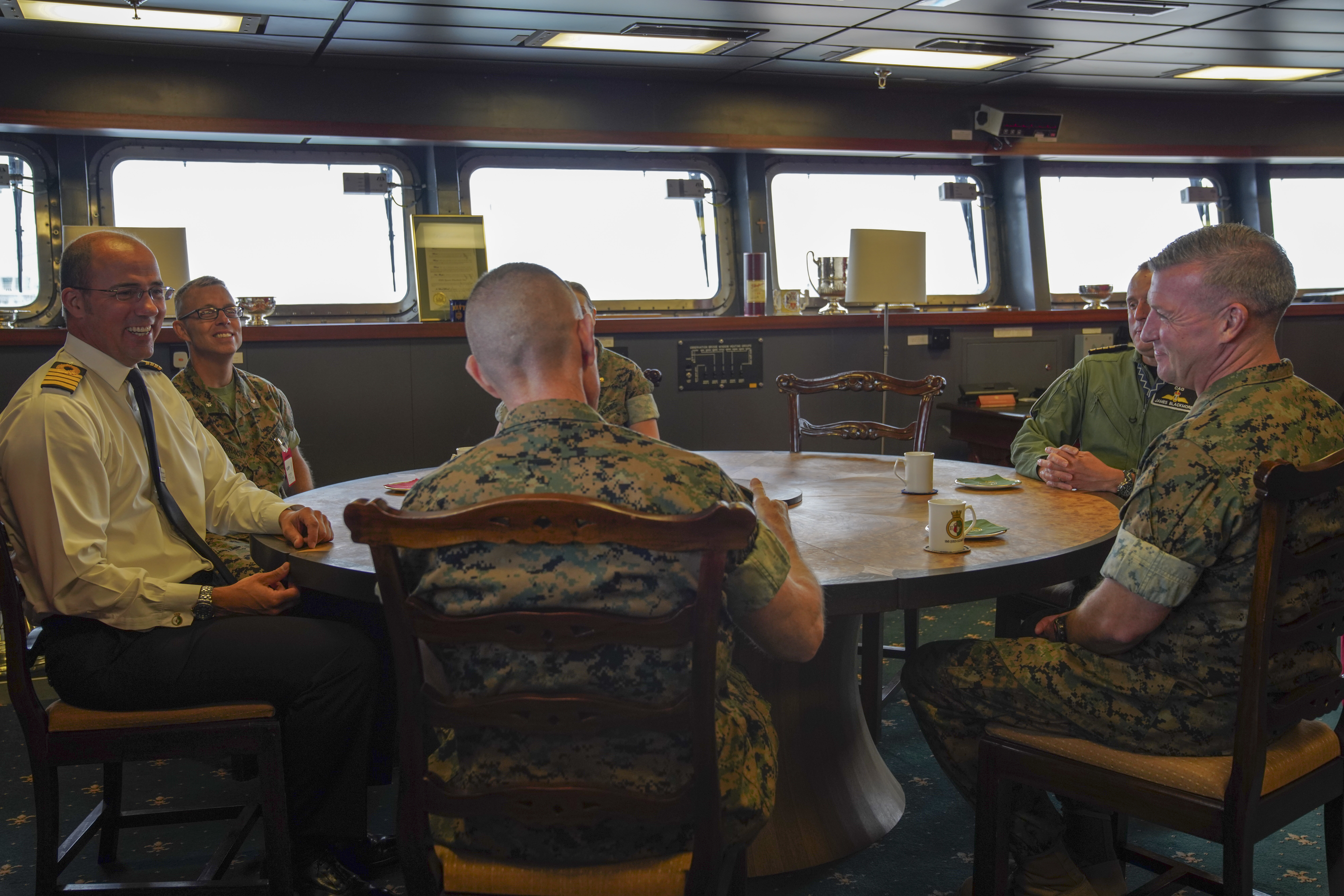 Maj. Gen. Stephen M. Neary, center, commander of U.S. Marine Corps Forces Europe and Africa, visits with members of the UK Royal Navy and Col. Doran, right, the senior U.S. national representative to Carrier Strike Group-21, aboard the HMS QNLZ in Portsmouth, England, August 27, 2020. Maj. Gen. Neary toured the ship to increase understanding of Marine Fighter Attack Squadron (VMFA) 211’s future operations with the UK’s Carrier Strike Group-21 during an upcoming deployment alongside their Royal Navy and Royal Marine Corps counterparts. (U.S. Marine Corps photo by Staff Sgt. Brytani Musick)