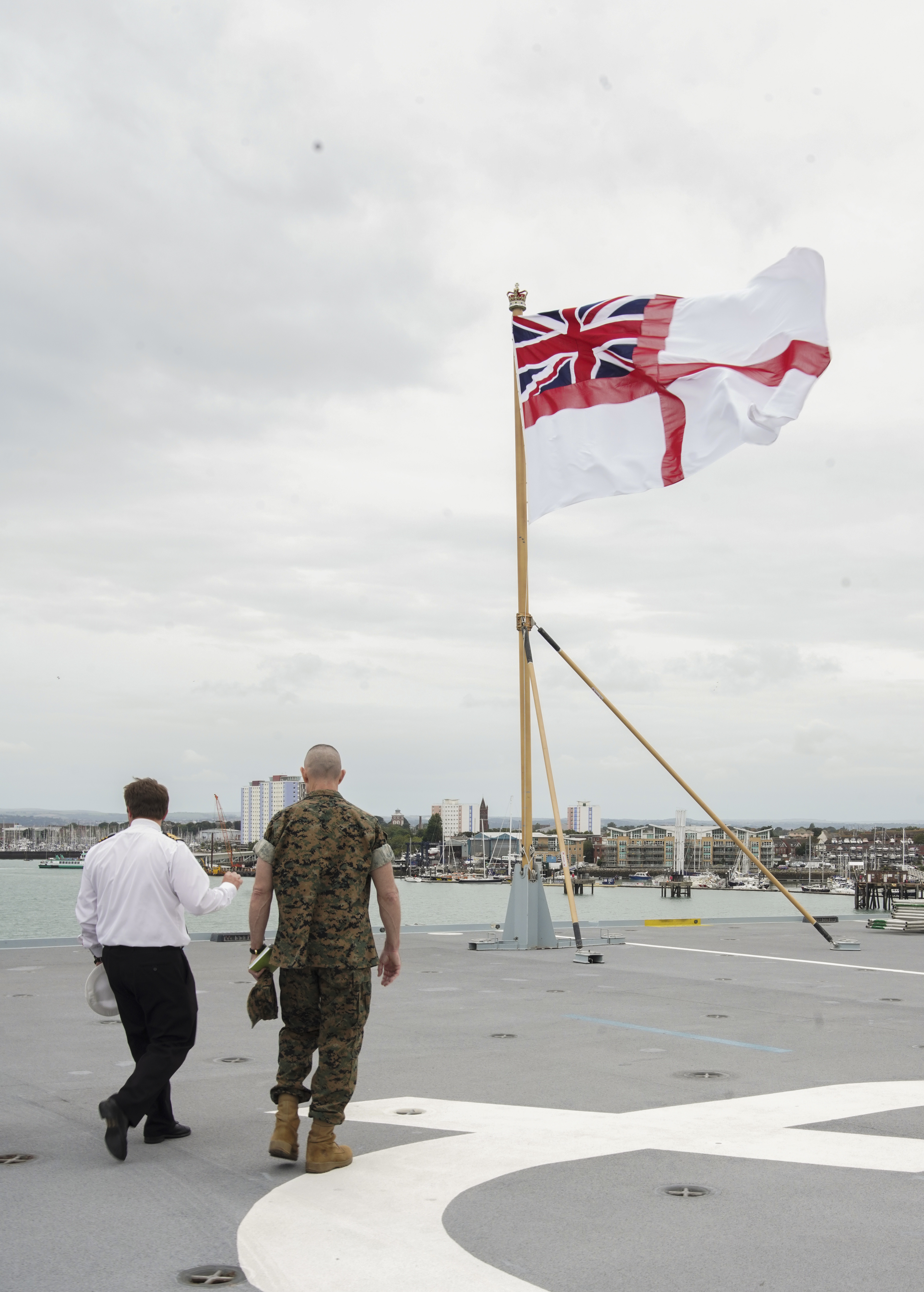 Maj. Gen. Stephen M. Neary, front, the commander of U.S. Marine Forces Europe and Africa, tours the flight deck of the HMS Queen Elizabeth in Portsmouth, England, August 27, 2020. Maj. Gen. Neary toured the ship to increase understanding of Marine Fighter Attack Squadron (VMFA) 211’s future operations with UK’s Carrier Strike Group-21 during an upcoming deployment alongside their Royal Navy and Royal Marine Corps counterparts. (U.S. Marine Corps photo by Staff Sgt. Brytani Musick)