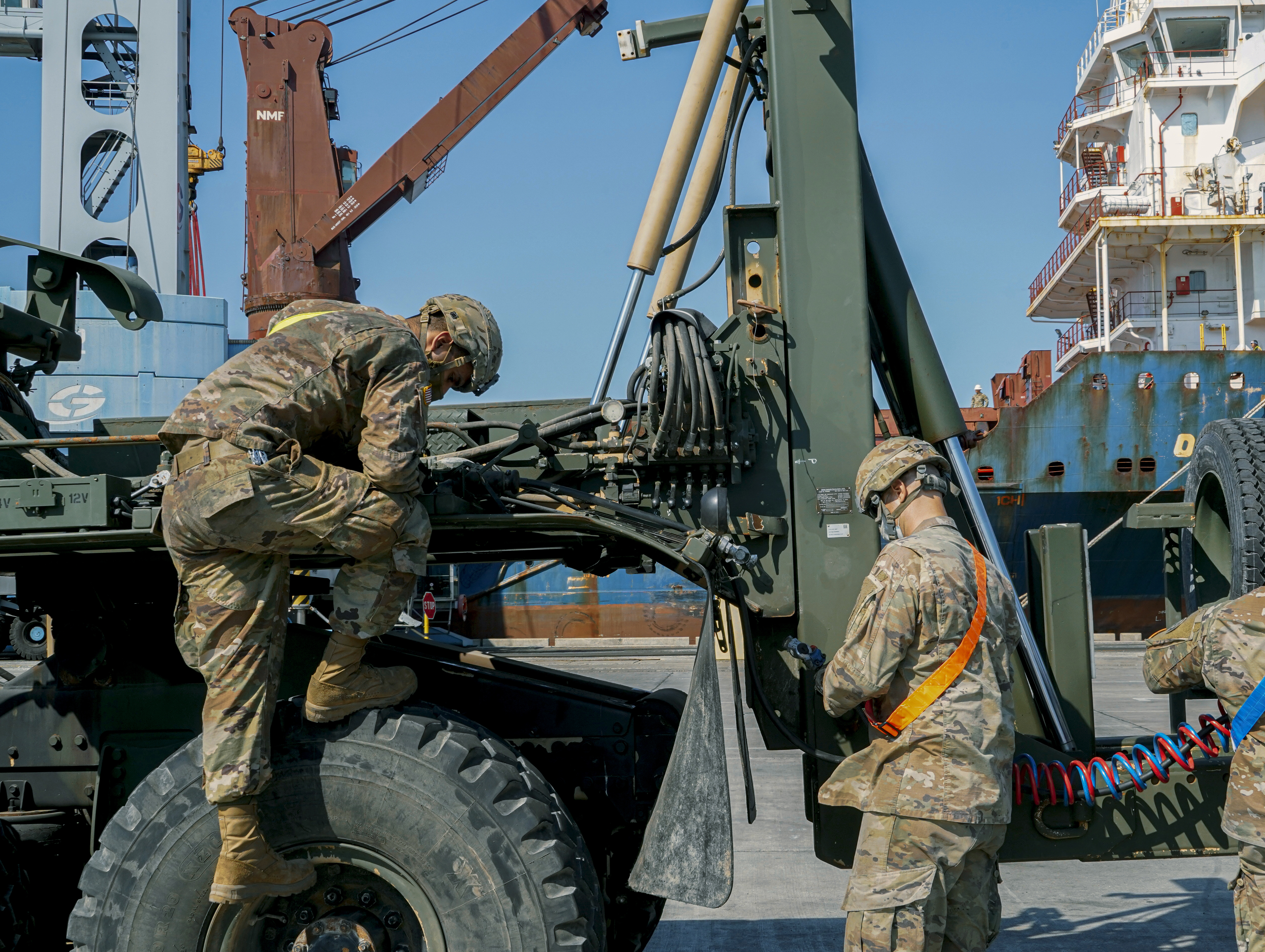 A U.S. Soldier, assigned to the 4th Squadron, 2d Cavalry Regiment, connects a trailer to a vehicle during port operations for the Noble Partner 20 exercise in Poti, Georgia, Sept. 4, 2020. Exercise Noble Partner is designed to enhance regional partnerships and increase U.S. force readiness and interoperability in a realistic, multinational training environment. The exercise allows participants to conduct situational training exercises, live-fire exercises and combined mechanized maneuvers. The 4th Squadron, 2d Cavalry Regiment (Sabers) will lead the exercise for 2d Cavalry Regiment.