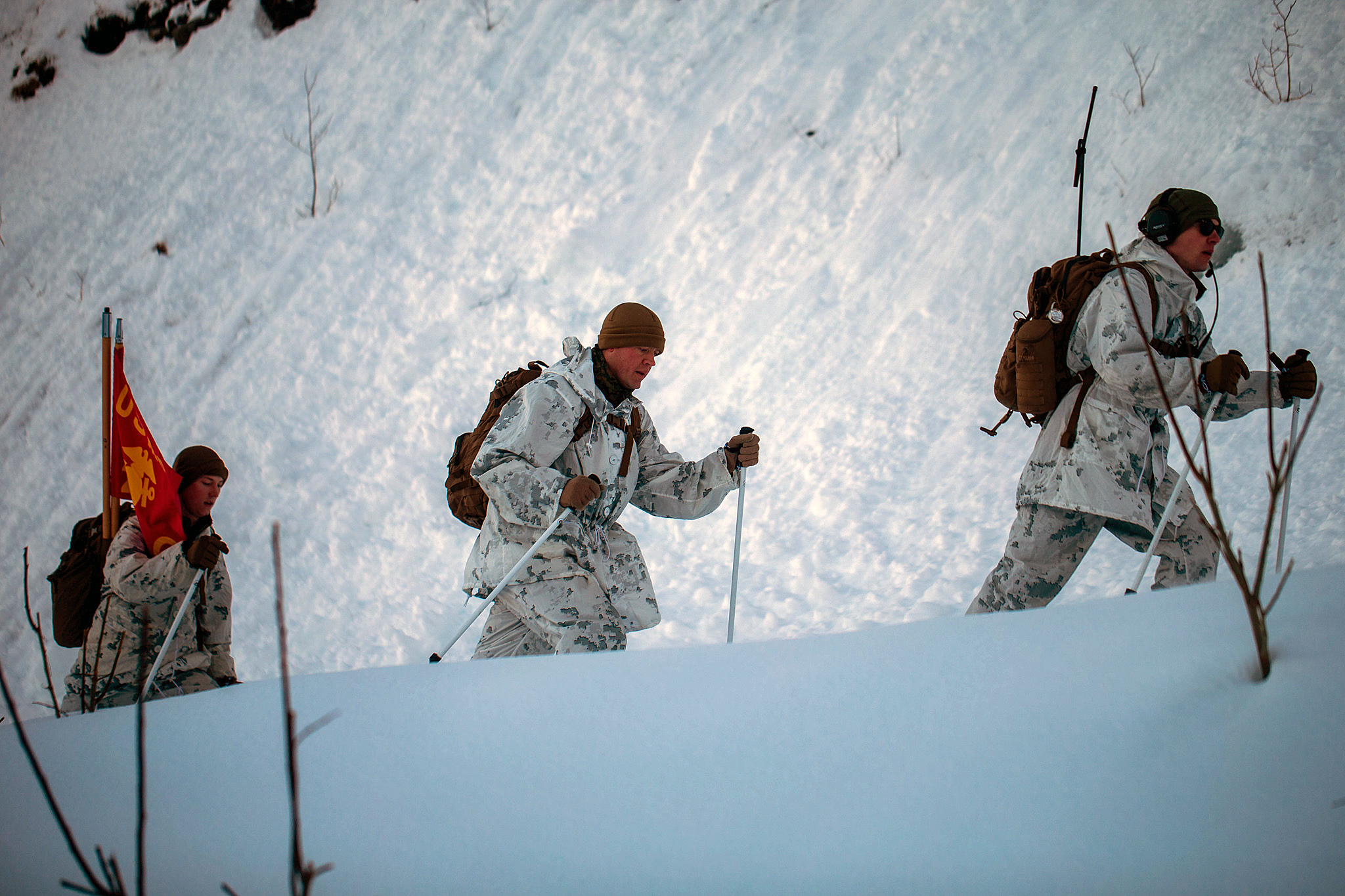 U.S. Marines with Charlie Company, 2nd Law Enforcement Battalion, II Marine Expeditionary Force Information Group, conduct a 3-mile hike using snowshoes during cold-weather training near Bjerkvik, Norway, March 8, 2020. Marines are in Norway preparing for Exercise Cold Response, a Norwegian-led exercise designed to enhance military capabilities and allied cooperation in high-intensity warfighting in a challenging arctic environment. (U.S. Marine Corps photo by Cpl. Isaiah Campbell)