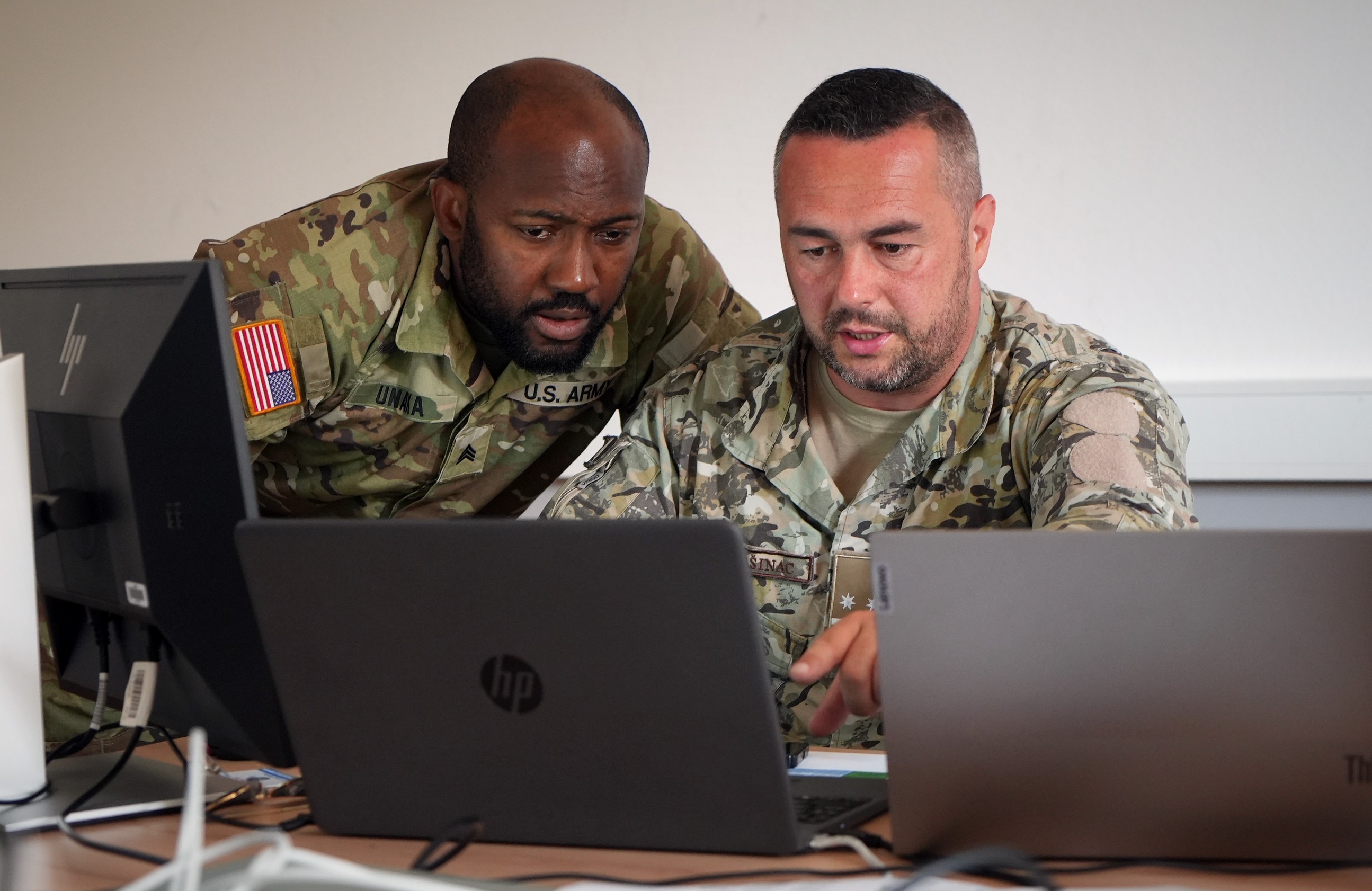 Maryland Army National Guard Sgt. Emmanuel Unaka, cyber threat intelligence analyst with Cyber Protection Team 169, listens to Armed Forces of Bosnia and Herzegovina Lt. Armin Kolašinac, a Security Operations Center member, as part of a blue team during the Adriatic Regional Security Cyber Cooperation exercise at the Slovenian Armed Forces Baron Andrej Čehovin barracks in Postojna, Slovenia, July 5, 2024. The two-week cyber security training event included representatives from six Adriatic nations working alongside their U.S. National Guard counterparts.