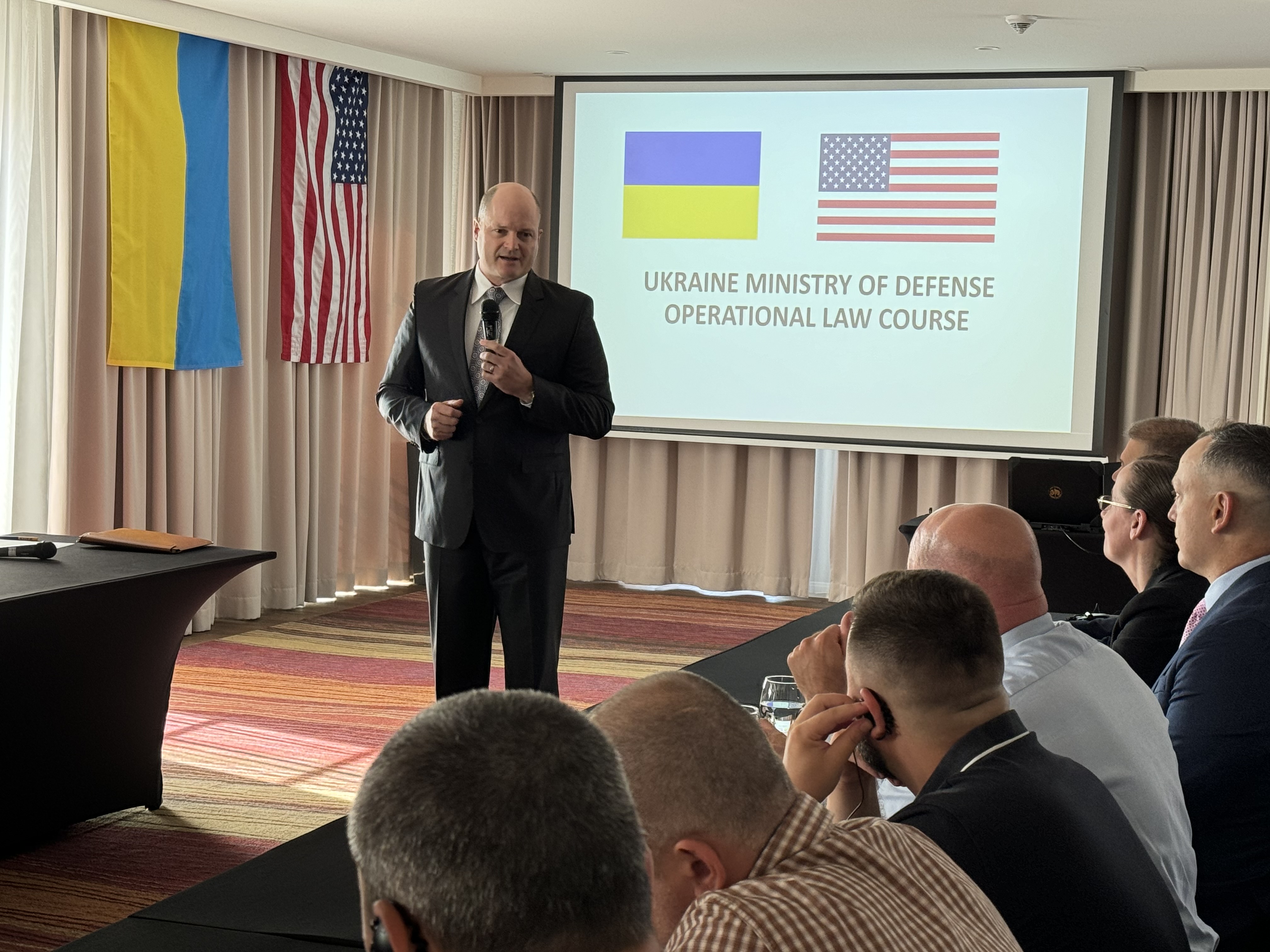 U.S. European Command Staff Judge Advocate U.S. Army Col. Ian Iverson provides welcoming remarks to Ukrainian Armed Forces and U.S. Army Europe and Africa military legal professionals ahead of a two-week course on operational law held in Poland from July 22 to Aug. 5, 2024. The training aimed to inform U.S. military lawyers of the unique challenges facing UAF counterparts, and support those Ukrainian military legal professionals in advising their commanders and enabling operations.