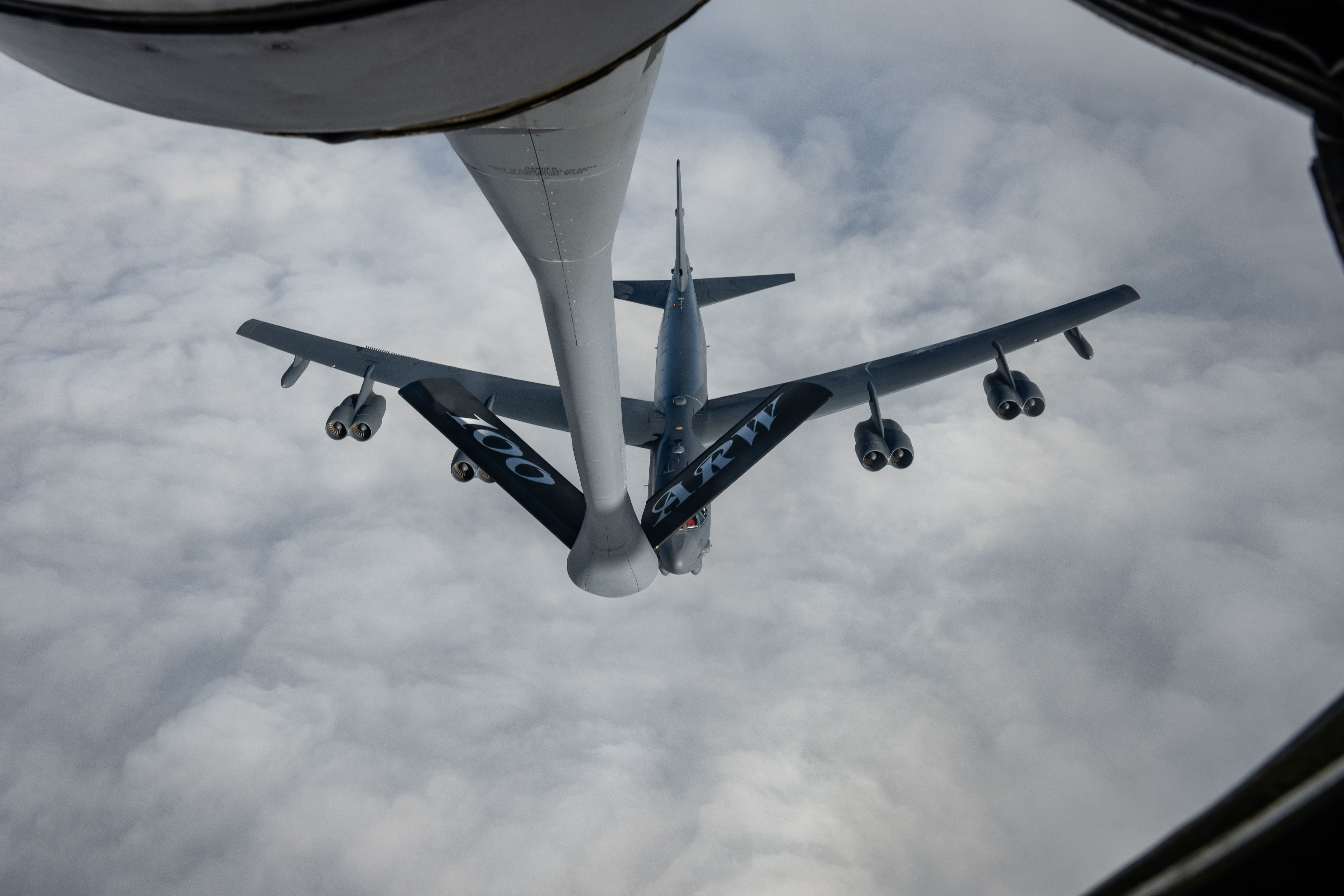 A U.S. Air Force B-52 Stratofortress from the 5th Bomb Wing, Minot Air Force Base, N.D., receives fuel from a KC-135 Stratotanker from the 100th Air Refueling Wing, based at Royal Air Force Mildenhall, England, over the North Sea, Sept. 11, 2024. Bomber Task Force missions are representative of the U.S.’ extended deterrent commitment to Allies and partners and enhance regional security.