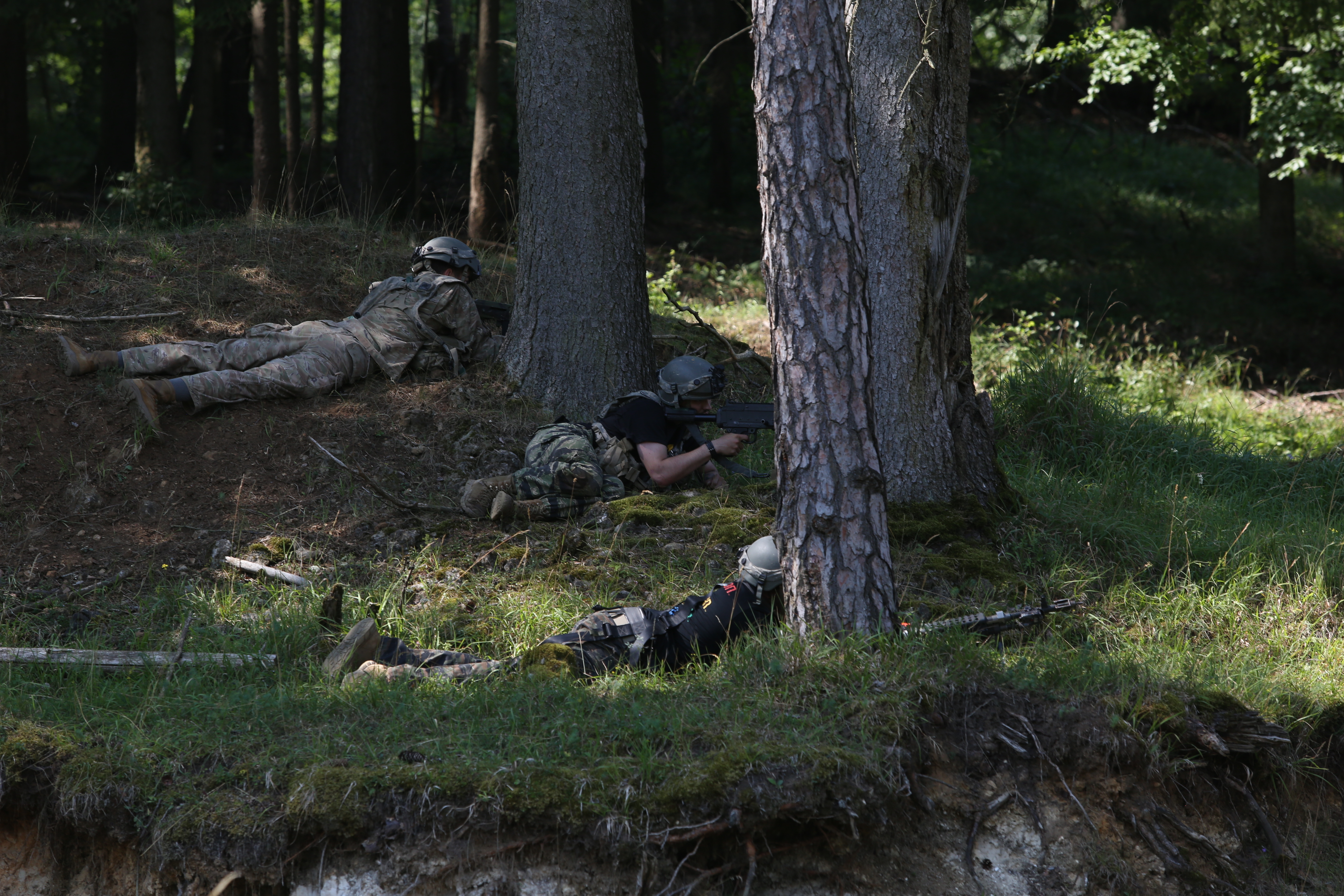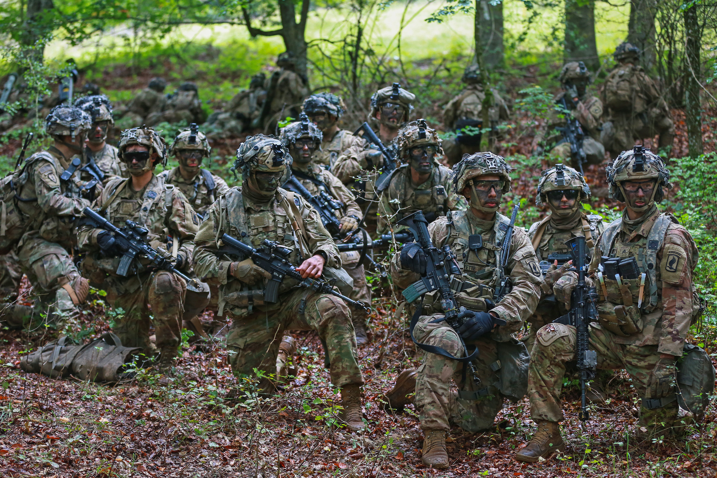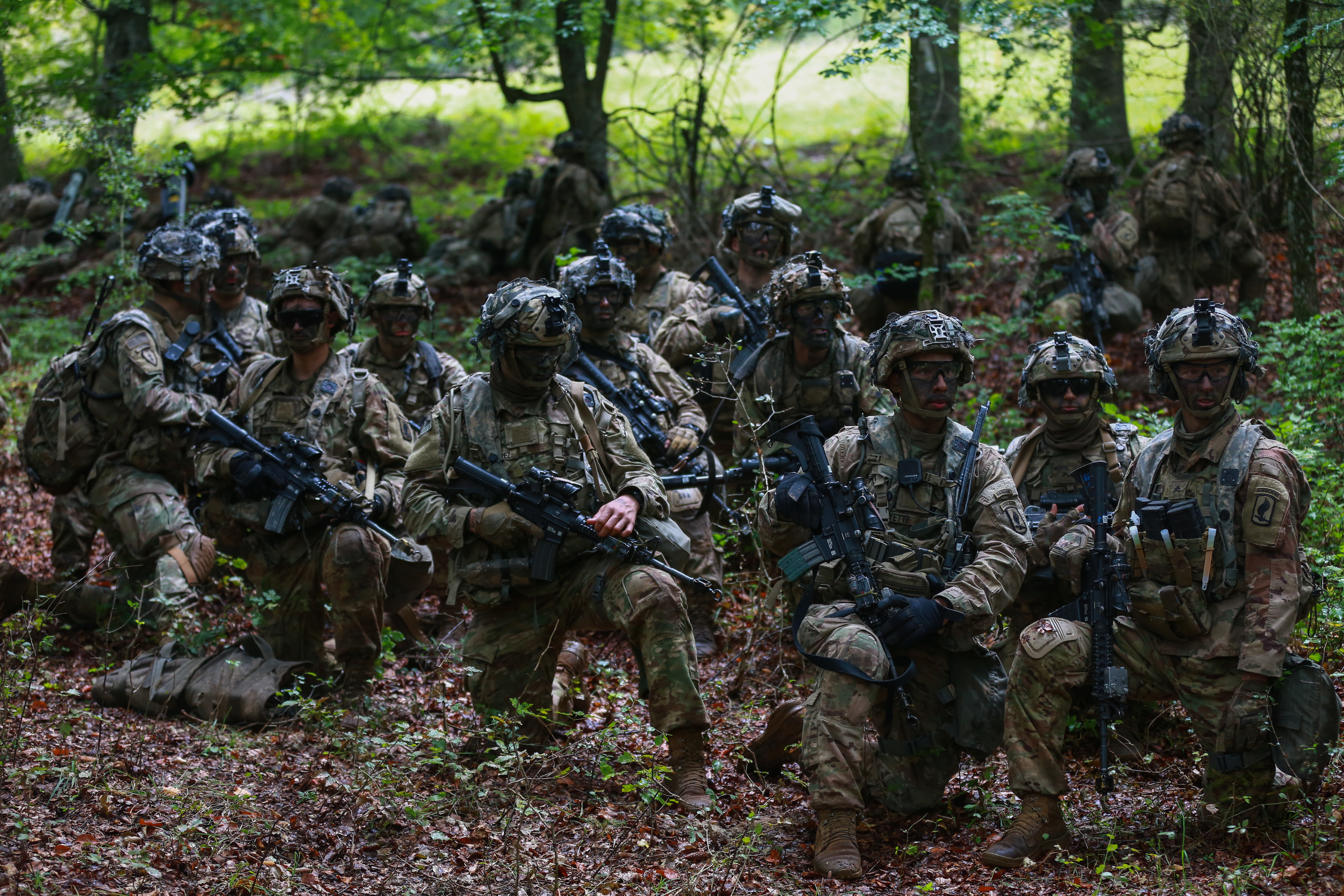 U.S. Soldiers with the 173rd Airborne Brigade rally together after a patrol during Saber Junction 19 at the Hohenfels Training Area in Germany, Sept. 26, 2019. Saber Junction 2019 (SJ19) is an exercise involving nearly 5,400 participants from 16 ally and partner nations at the U.S. Army’s Grafenwoehr and Hohenfels Training Areas, Sept. 3 to 30 Sept. 2019. SJ19 is designed to assess the readiness of the U.S. Army’s 173rd Airborne Brigade to execute land operations in a joint, combined environment and to promote interoperability with participating allies and partner nations. (U.S. Army Photo by Spc. Audrequez Evans)