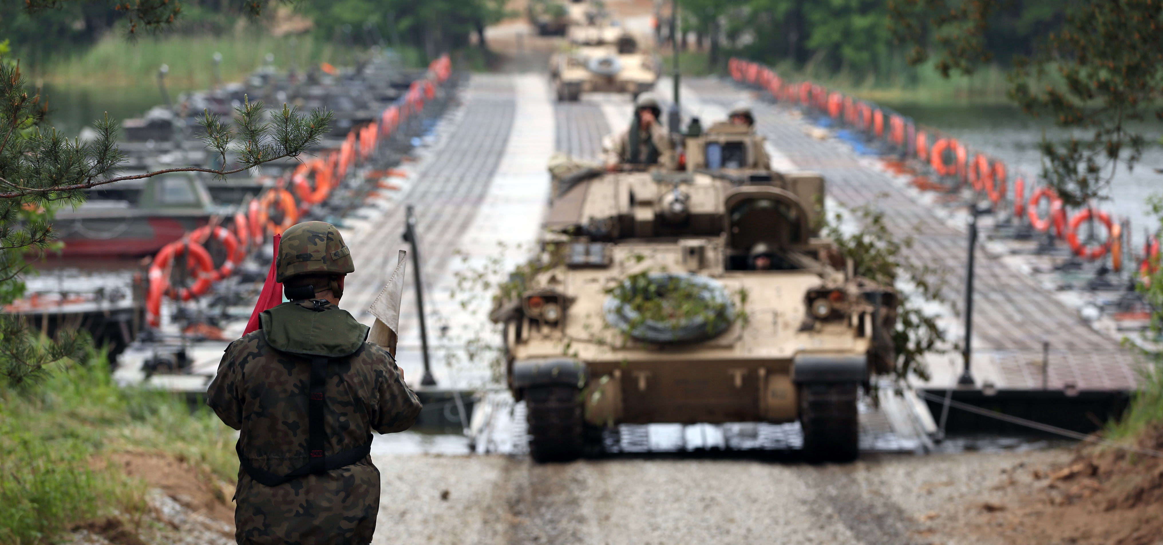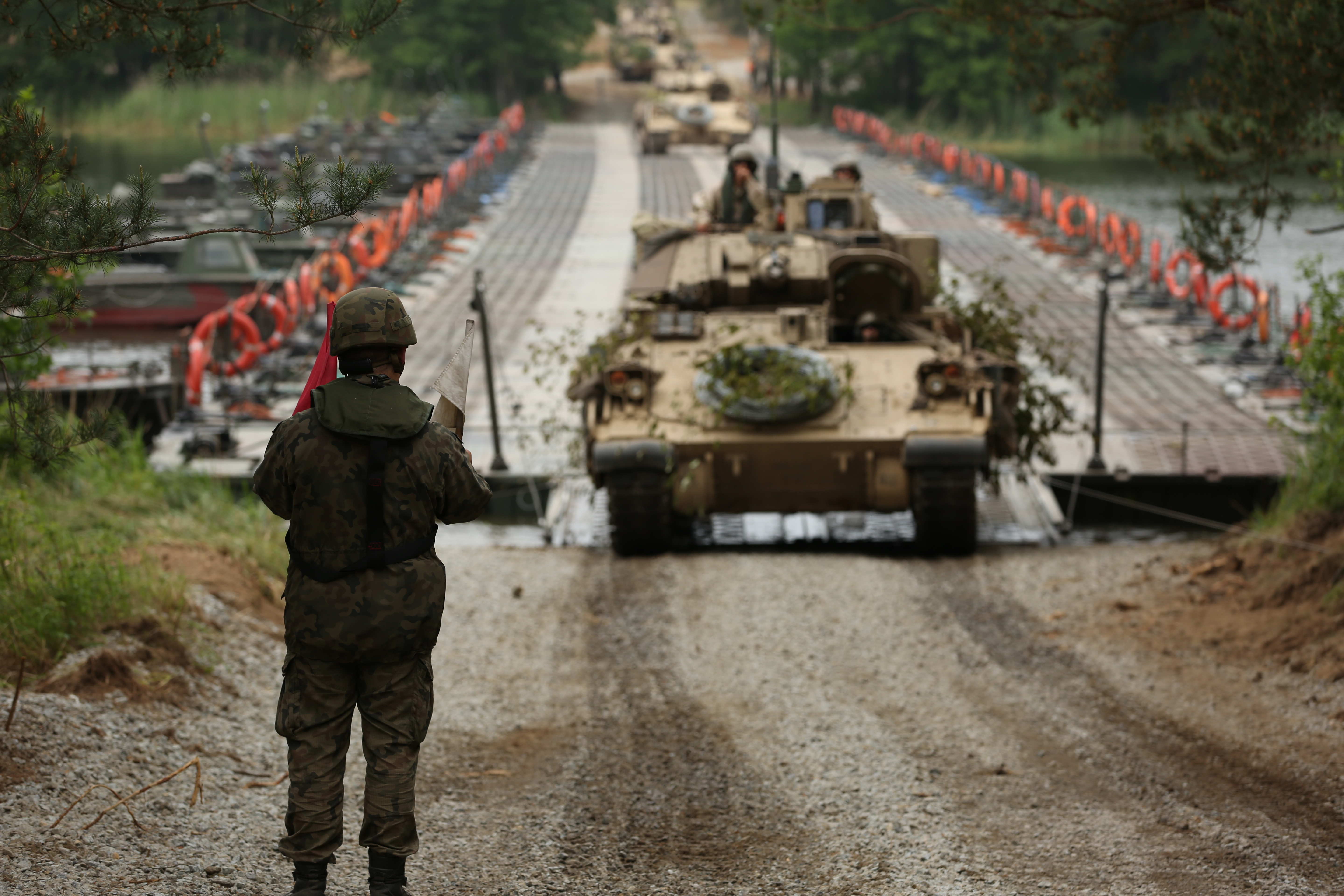 A Polish soldier guides U.S. Soldiers in a Bradley Fighting Vehicle off a bridge during exercise Allied Spirit at Drawsko Pomorskie Training Area, Poland, June 11, 2020. Exercise Allied Spirit is a Defender-Europe 20 linked exercise involving approximately 6,000 U.S. and Polish soldiers. The modified exercise will test a division-sized unit's ability to conduct a deliberate water crossing, integrate with alliance capabilities and establish a common intelligence operational picture. The exercise, modified in response to COVID-19, operates in accordance with the guidance directed by DoD and host nations. All U.S. Soldiers and civilians involved in the exercise completed a 14-day quarantine and were tested for COVID-19 upon arrival with additional health screenings if necessary. (U.S. Army photo by Sgt. Randis Monroe)