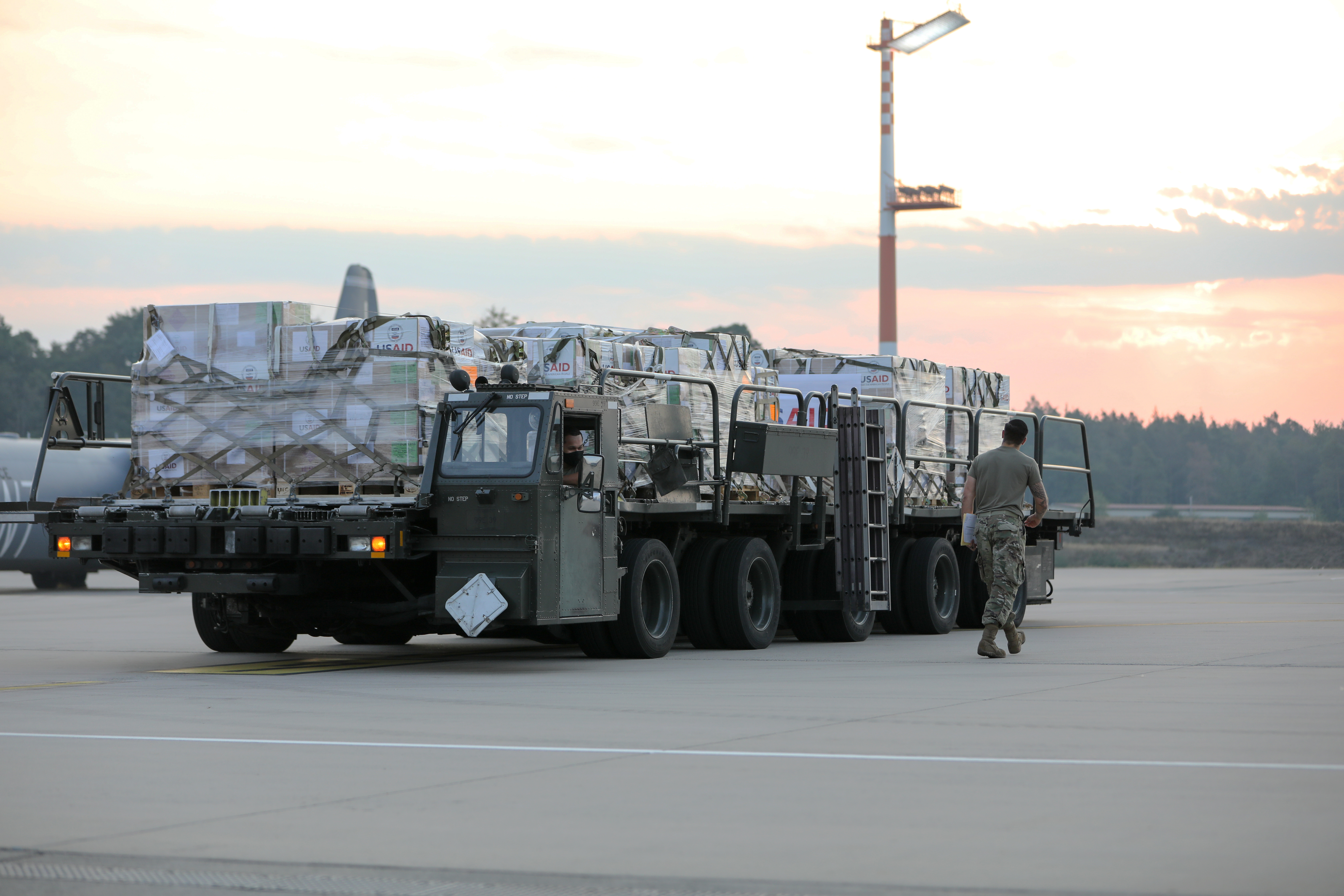 U.S. Army and Air Force service members assisted USAID with the transportation of nearly 12,000 pounds of medical kits from the Netherlands, through Germany and on to Lebanon. These kits contain items such as medicines, bandages, gauze, examination gloves, thermometers and syringes. The International Emergency Medical Kits are designed to enable local hospitals address the critical medical needs of the victims of the recent explosion and COVID-19. (U.S. Army photo by Staff Sgt. Benjamin Northcutt, 21st Theater Sustainment Command)and)