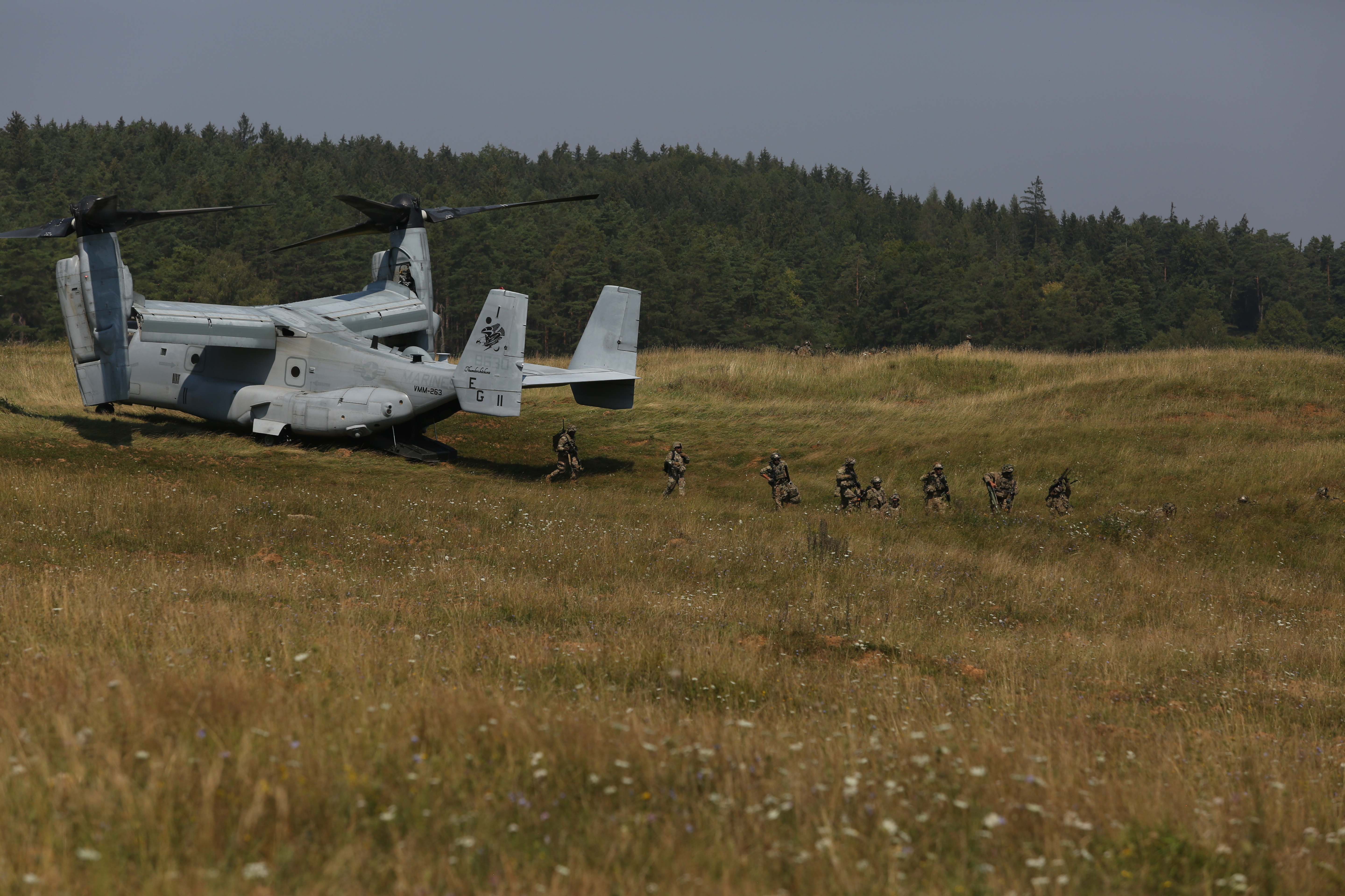 Marines and Soldiers work together on day one as they infiltrate Hohenfels kicking off exercise Saber Junction 20 in Hohenfels, Germany on Aug. 10, 2020. Saber Junction 20 is a 7th Army Training Command-conducted, U.S. Army Europe-directed annual exercise designed to assess the readiness of the U.S. Army's 173rd Airborne Brigade to execute unified land operations in a joint, combined environment, and to promote interoperability with participating allies and partner nations. This year's exercise will take place primarily at 7ATC's Grafenwoehr and Hohenfels Training Areas in Bavaria. U.S. military forces stationed in Europe routinely conduct these types of exercises with allied and partner nations to enhance interoperability and readiness. (Photo by Spc. Ravenne Eschbach)