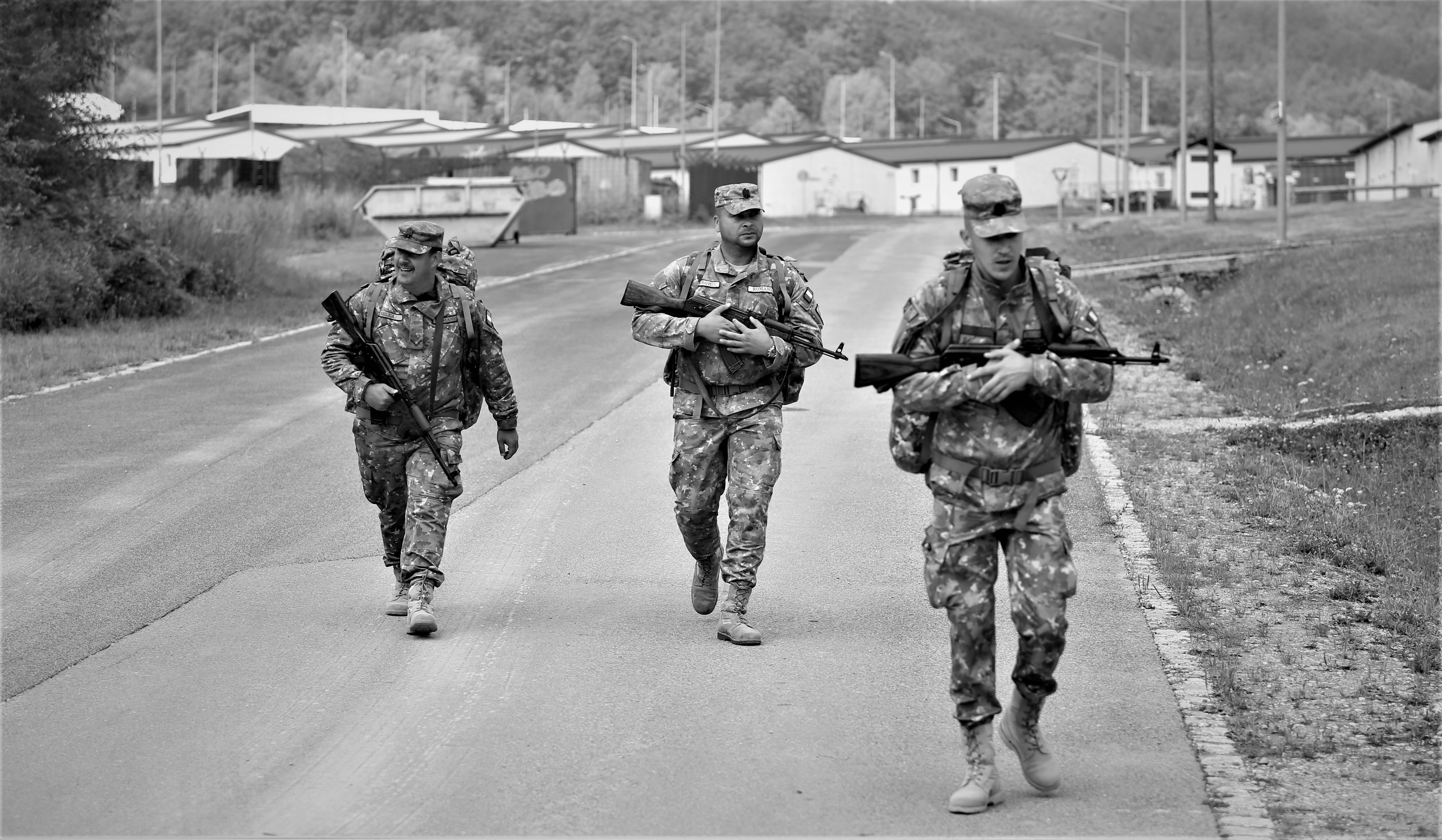 Romanian soldiers participates in a ruck march during Saber Junction, at the Joint Multinational Readiness Center, Hohenfels, Germany, Aug.5, 2020. Saber Junction 20 is a 7th Army Training Command-conducted, U.S. Army Europe-directed annual exercise designed to assess the readiness of the U.S. Army's 173rd Airborne Brigade to execute unified land operations in a joint, combined environment, and to promote interoperability with participating allies and partner nations. This year's exercise will take place primarily at 7ATC's Grafenwoehr and Hohenfels Training Areas in Bavaria. U.S. military forces stationed in Europe routinely conduct these types of exercises with allied and partner nations to enhance interoperability and readiness. (U.S. Army Photo by Spc. Ravenne Eschbach)
