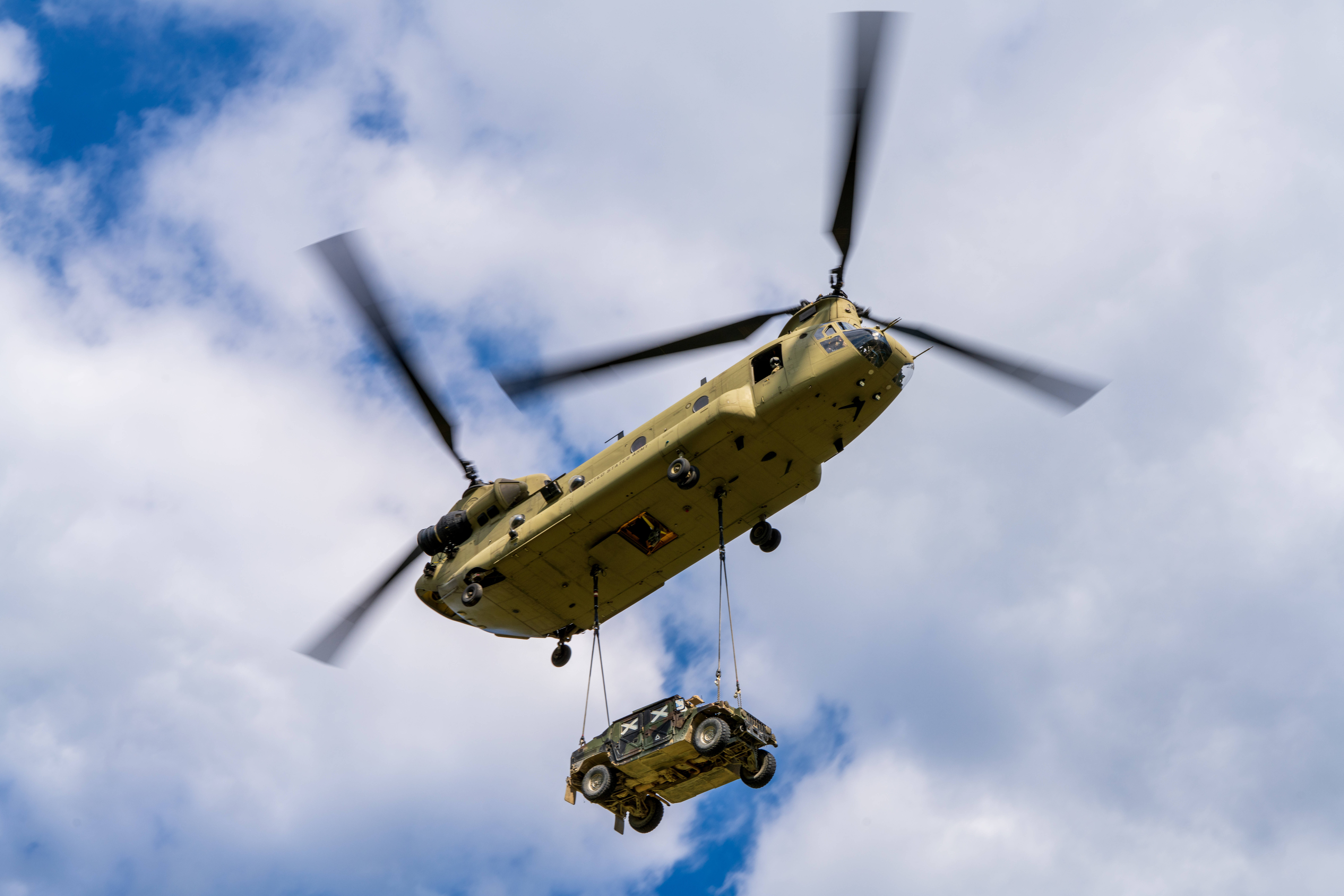 A CH-47 Chinook helicopter from B Co "Big Windy," 1-214th General Support Aviation Battalion transports a 173rd Airborne Brigade tactical vehicle during sling load training at Grafenwöhr Training Area on Aug. 5 as part of Saber Junction 20. (U.S. Army photo by Maj. Robert Fellingham)