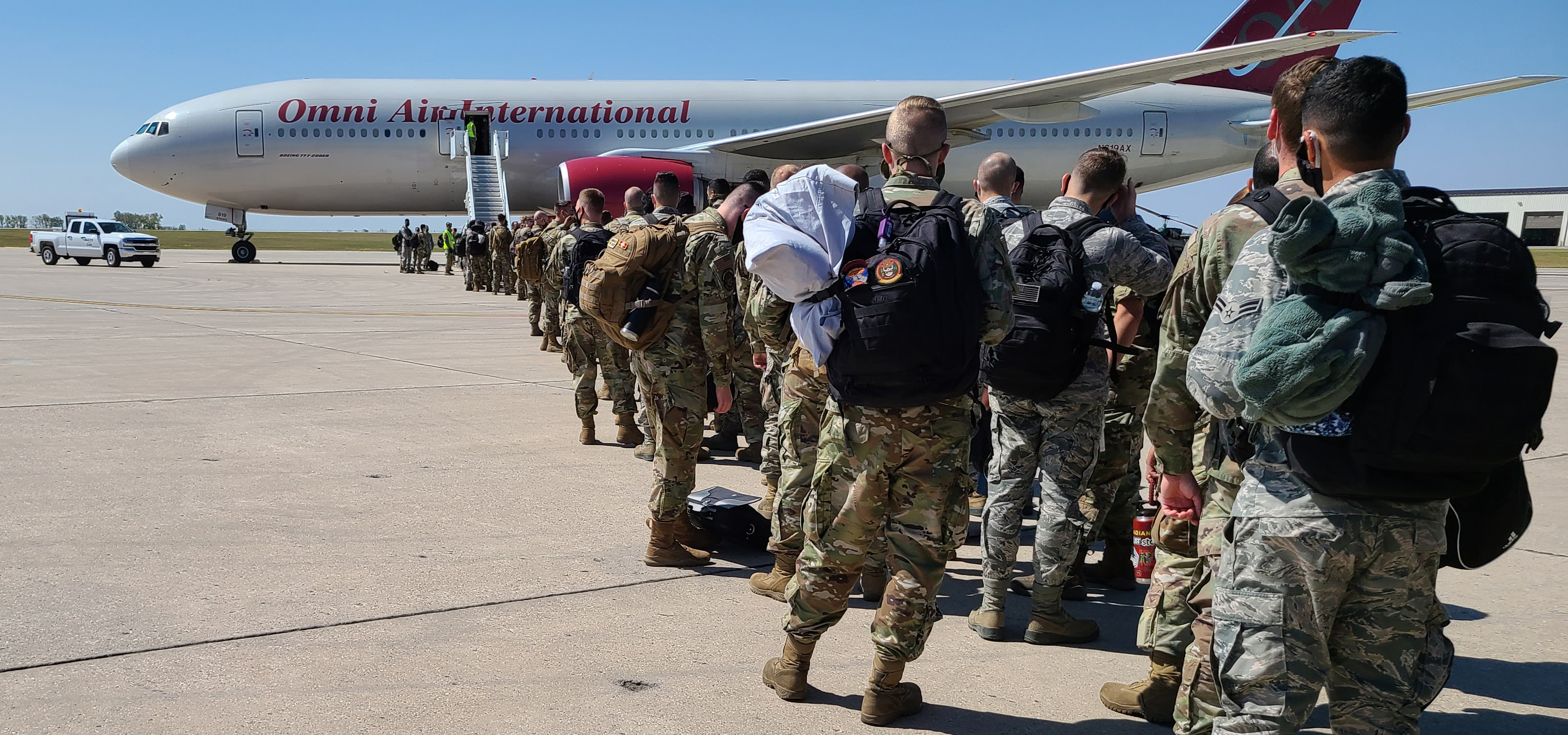 Airmen from the 5th Bomb Wing board a jet to deploy to RAF Fairford on Aug. 24, 2020 at Minot Air Force Base, N.D. The Airmen were deploying in support of a B-52 bomber training mission. (U.S. Air Force photo by Airman 1st Class Josh W. Strickland)