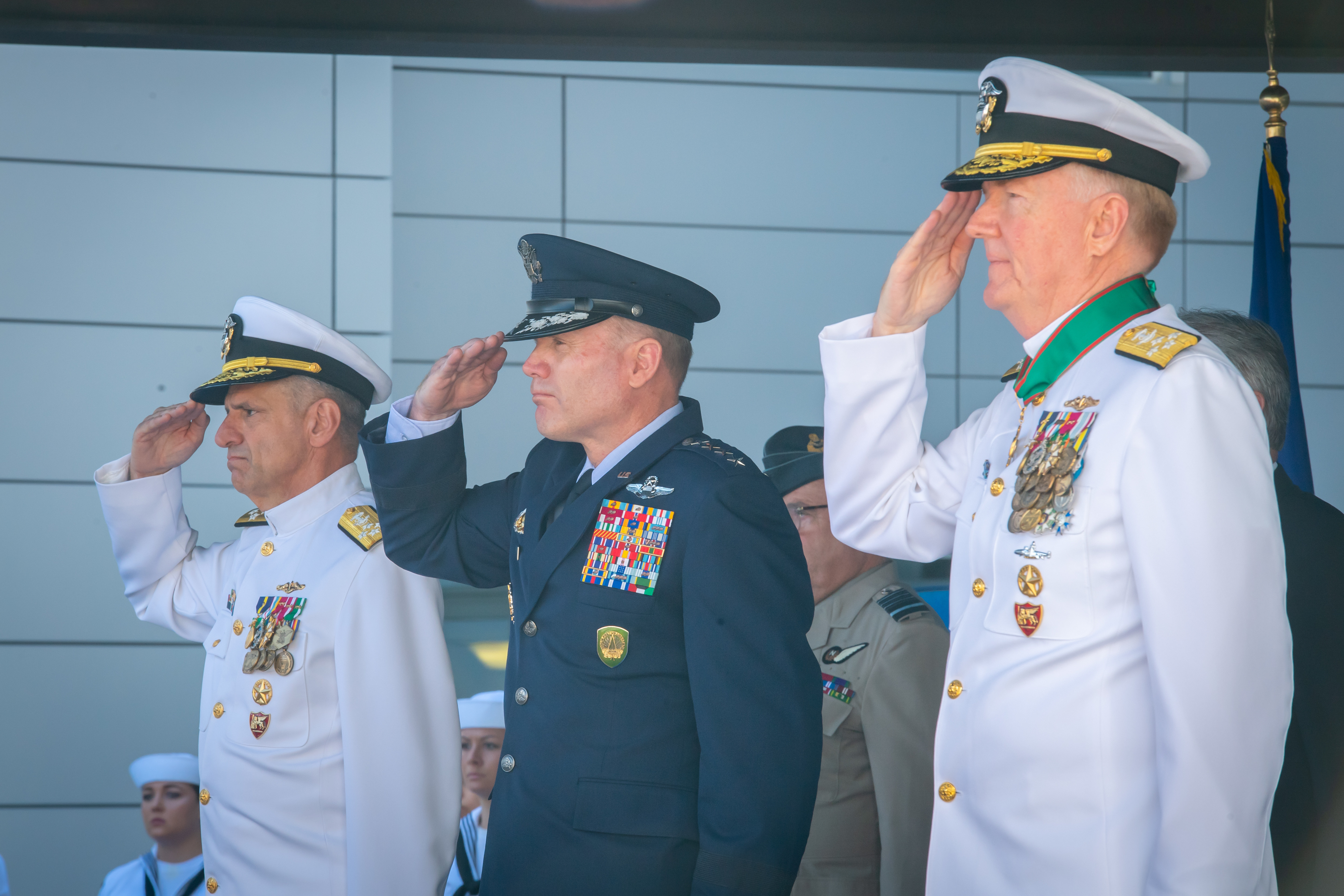 200717-N-NO090-1002 NAPLES, Italy (July 17, 2020) Adm. Robert P. Burke, Gen. Tod D. Wolters, commander, U.S. European Command and Supreme Allied Commander Europe, and Adm. James G. Foggo III, commander, U.S. Naval Forces Europe-Africa and commander, Allied Joint Force Command-Naples, salute the colors during the U.S. Naval Forces Europe-Africa, Allied Joint Force Command change of command ceremony. Adm. Foggo was relieved by Adm. Robert P. Burke at Allied Joint Force Command (JFC) Naples, Italy, July 17, 2020. U.S. Naval Forces Europe-Africa, headquartered in Naples, Italy, conducts the full spectrum of joint and naval operations, often in concert with allied and interagency partners, in order to advance U.S. national interests and security and stability in Europe and Africa. (Photo courtesy of JFC Public Affairs, German Airforce Master Sergeant Florian Fergen)