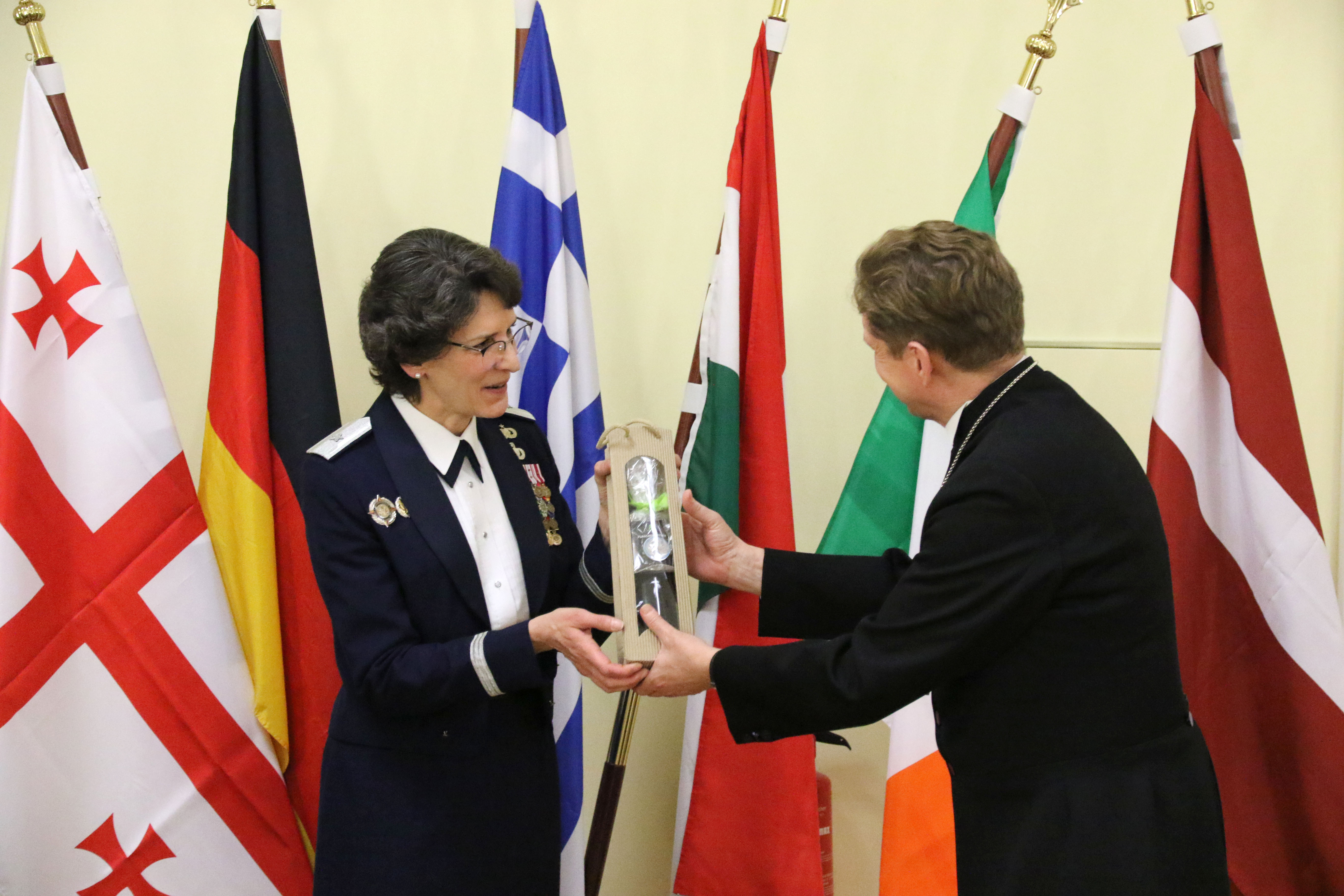 Military Dean Dr. Dirck Ackermann, Evangelical Church with the Office of the Bundeswehr, presents a gift to U.S. Air Force Brig. Gen. Jessica Meyeraan, USEUCOM's deputy director for plans, policy, strategy and capabilities, at the 31st annual International Military Chiefs of Chaplains Conference in Berlin this past week. The yearly conference serves as an international and interfaith forum for dialogue among military chaplain leadership (predominantly) from Europe and North America to enhance partnerships, foster collegiality and bolster mutually supportive working relationships