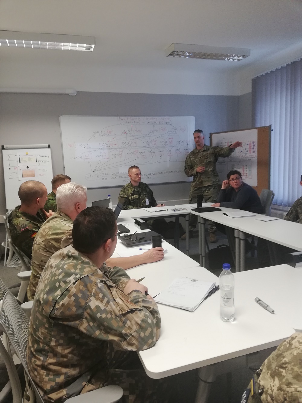 Lt. Col. Aaron Cornett, standing, leads classroom discussion in building a joint headquarters command and control structure, to students at the Baltic Defense College in Tartu, Estonia. Cornett and his colleague, Lt. Col Richard Towner, are the only two U.S. Army instructors at the college. (Courtesy photo)
