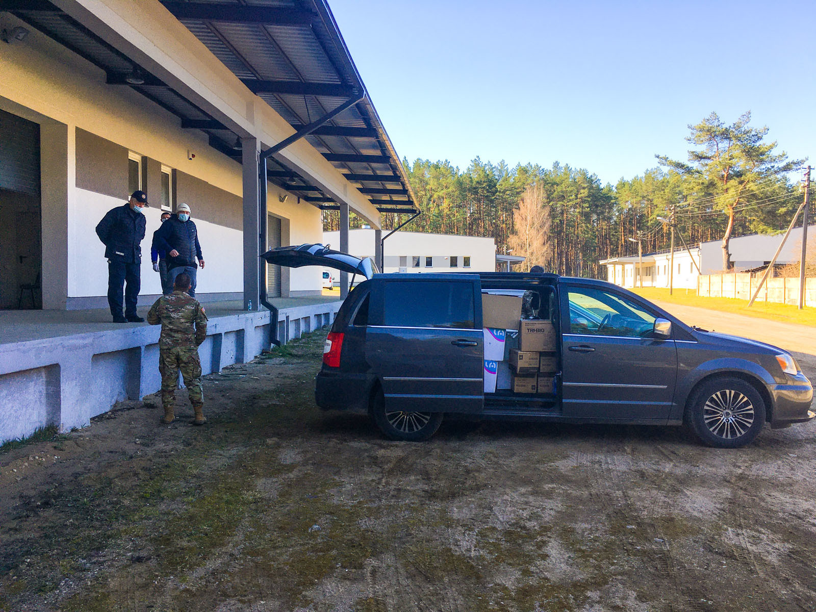 Soldiers from Bravo Company, 331st Civil Affairs Team, 418th Civil Affairs Battalion, unload supplies from the back of a van and into a warehouse in Nemencine, Lithuania, on April 14, 2020. The 331st along with the US Embassy Office of Defense Cooperation (ODC) and the Defense Attaché Office (DATT), delivered medical supplies to a Lithuanian state distribution center. These medical supplies will be dispersed throughout the community.